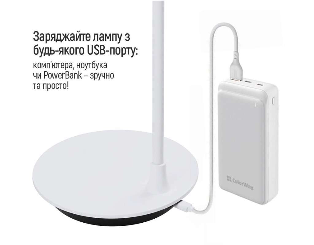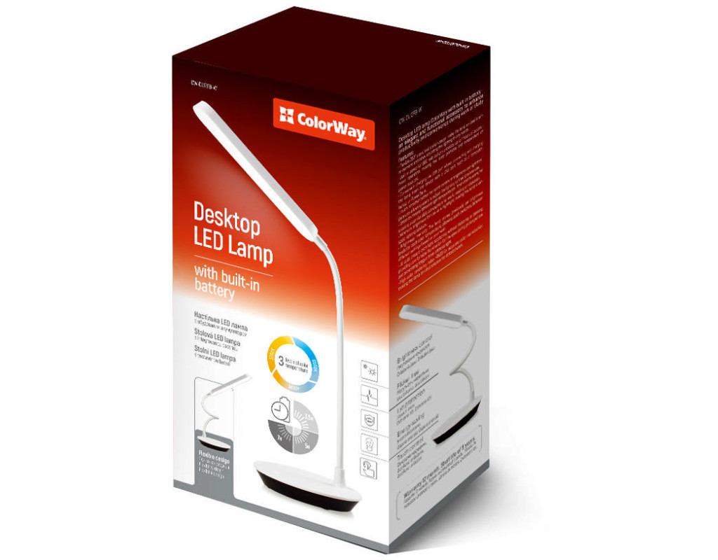 Настільна світлодіодна лампа ColorWay з вбудованим акумулятором — поєднує елегантний дизайн та високу функціональність, що робить її ідеальним вибором для роботи та навчання. Лампа має гнучку ніжку, яка дозволяє налаштувати освітлення під ваші потреби. Завдяки акумулятору ємністю 1800 mAh вона може працювати до 7 годин безперервно, а зарядка через USB (від комп'ютера, ноутбука або PowerBank) додає зручності у використанні. Лампа підтримує три режими температури освітлення: тепле світло, біле світло та природне денне світло. Перемикати режими та вмикати/вимикати лампу можна за допомогою сенсорної кнопки, яка також забезпечує плавне регулювання яскравості і запам'ятовує ваші налаштування. 36 світлодіодів забезпечують рівномірне, безвідблискове освітлення, створюючи комфортну атмосферу для будь-якої діяльності. - Час заряду 5 годин.