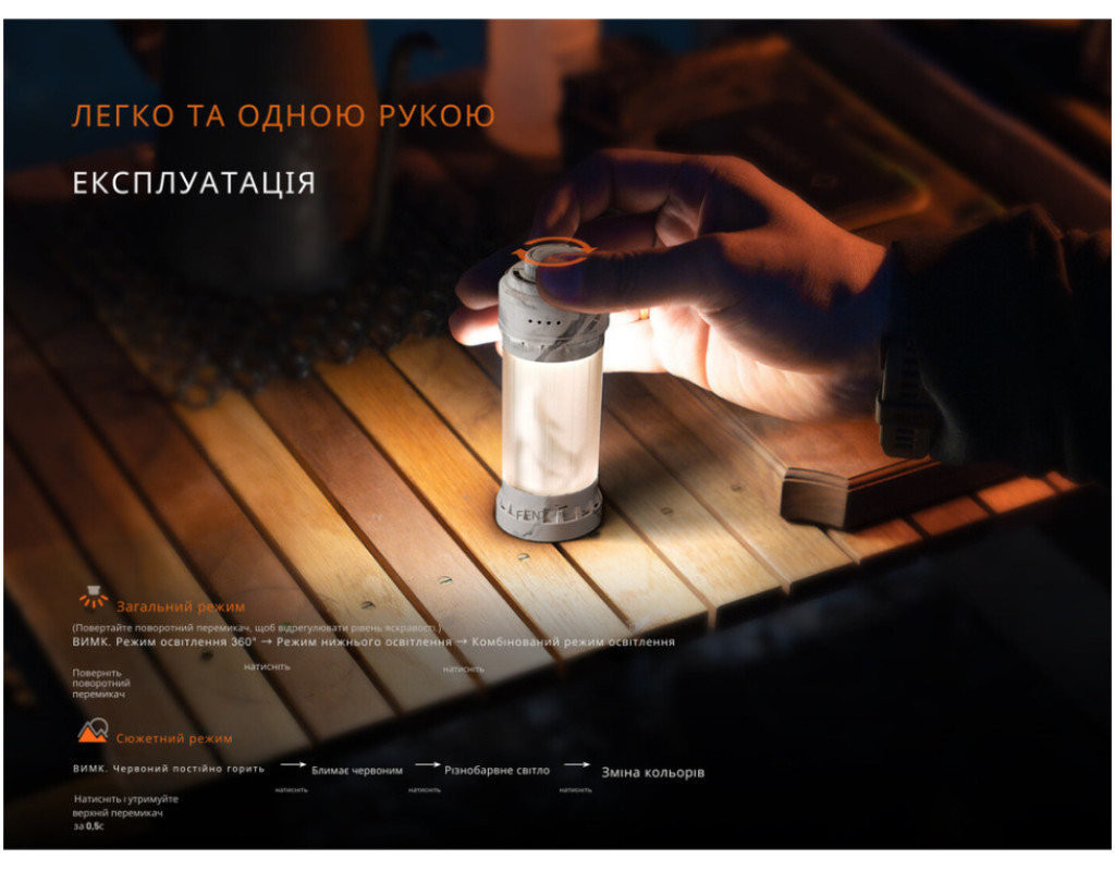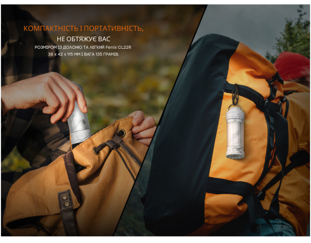 | Ліхтар Fenix CL22R білий (CL22RWH) – це багатофункціональний кемпінговий ліхтар, що поєднує в собі передовий дизайн та високу якість освітлення. Ідеально підходить як для туризму, так і для використання в повсякденному житті, зокрема, у разі відключення електроенергії вдома. Його стильний корпус, натхненний античною римською колоною, впишеться у будь-який інтер'єр. Ліхтар оснащений світлодіодами COB та має вбудований холодний білий діод Redslight SC1818C і 12 діодів WS2812B-3535, що забезпечують багатофункціональність у освітленні. Світлодіоди мають тривалий термін служби, що перевищує 50 тисяч годин, що робить Fenix CL22R надійним помічником на довгі роки. Завдяки своїй потужності, цей ліхтар здатен забезпечити яскравість до 300 люмен з дальністю світлового потоку до 80 м, створюючи оптимальні умови для вивчення місцевості. Багатий вибір режимів – від мінімального до комбінованого та кольорового освітлення – допоможе налаштувати світло під будь-які обставини. Всього 12 режимів, серед яких стандартне освітлення на 360° з колірною температурою 3000К та спрямоване вниз освітлення з температурою 6500К. Однією з унікальних переваг цього ліхтаря є система захисту від перегрівання, яка працює в найпотужніших режимах, забезпечуючи безпечне та тривале використання. Крім того, акумулятор ємністю 2600 мАгод заряджається через порт USB Type-C, що дозволяє швидко поновлювати його заряд. Кольорова індикація рівня заряду підкаже, коли необхідно підзарядити пристрій. Корпус виготовлений з міцного полікарбонату, що робить ліхтар не тільки ударостійким, але й захищеним від вологи та пилу згідно класу захисту IP65. Він здатний витримувати падіння з висоти до 1.5 м, що є важливою перевагою в умовах активного відпочинку. Невеликі розміри (38 х 42 х 115 мм) та вага в 135 г дозволяють зручно транспортувати цей ліхтар, а різноманітні варіанти кріплення – використовувати його як для підвішування, так і як кишеньковий ліхтар. В комплектацію входять карабін та кабель для заряджання, що робить Fenix CL22R готовим до експлуатації з моменту покупки. Ліхтар Fenix CL22R – це поєднання універсальності, надійності та інноваційних технологій, які забезпечать максимальний комфорт та автономність вашої подорожі. Забезпечивши до 200 год роботи без підзарядки, цей ліхтар стане вашим незамінним супутником у будь-яких умовах, від походів та кемпінгу до використання в домашньому господарстві. |