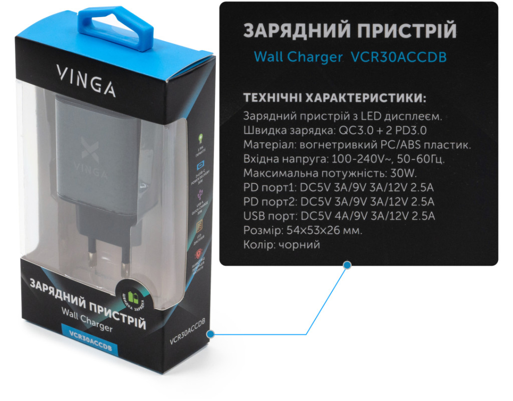 | Зарядний пристрій Vinga 2xUSB-C PD30W + USB-A QC30W Display 30W Max (VCR30ACCDB) – це ідеальне рішення для тих, хто цінує швидкість та якість зарядки своїх гаджетів. Цей потужний адаптер поєднує в собі передові технології, що забезпечують оптимальний рівень ефективності. Основна перевага даного пристрою – його універсальність. Vinga VCR30ACCDB підходить для смартфонів, рацій, смарт-годинників, TWS навушників, геймпадів, фітнес-браслетів, та навіть для екшн-камер. Завдяки підтримці стандартів швидкої зарядки Power Delivery 3.0 та Quick Charge 3.0, ваші пристрої будуть заряджені максимально швидко. Пристрій обладнаний трьома портами, два з яких – USB Type-C, і один – USB-A. Це дозволяє заряджати одразу декілька гаджетів одночасно. Максимальний вихідний струм складає 4 А, а загальна вихідна потужність досягає 30 Вт. Такі характеристики гарантують надійність та швидкість зарядки, незалежно від вашого місця перебування. Крім того, Vinga VCR30ACCDB має дисплей, що дозволяє відстежувати процес зарядки та контролювати споживану потужність. Це робить користування зарядним пристроєм не лише зручним, але й безпечним. Основна перевага цього зарядного пристрою – виняткова багатофункціональність в поєднанні з високою потужністю і надійністю, завдяки чому він стає незамінним помічником для всіх ваших електронних гаджетів. Не важливо, які пристрої ви використовуєте – з Vinga ви завжди будете готові до дії! |