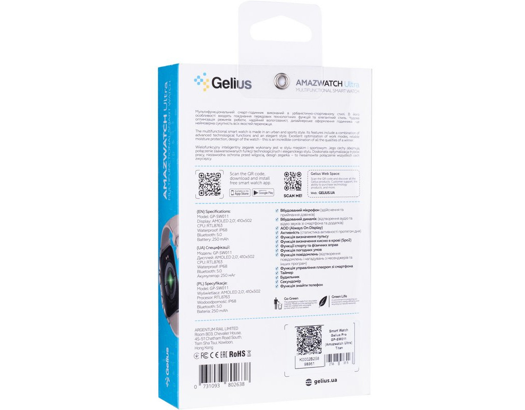 | Смарт-годинник Gelius Pro GP-SW011 (Amazwatch Ultra) Titan - це поєднання сучасних технологій та витонченого дизайну, що робить його ідеальним аксесуаром для кожного. Розроблений як для жінок, так і для чоловіків, цей унісекс-годинник з квадратною формою корпусу є відмінним вибором для тих, хто цінує стиль та функціональність. Яскравий 2-дюймовий AMOLED дисплей забезпечує виняткову чіткість та яскравість, дозволяючи насолоджуватися багатою палітрою кольорів. Електродисяйний екран використовує сенсорну технологію, що надає можливість легко переглядати повідомлення, здійснювати дзвінки та відстежувати здоров'я на лічені доторки. Годинник оснащений процесором RTL8763E, що разом з інтегрованими інтерфейсами підключення Wi-Fi та Bluetooth забезпечує безперебійну роботу. Версія Bluetooth 5.2 забезпечує швидке та стабільне з'єднання з вашими портативними пристроями. Навігація через GPS та різноманітні датчики - пульсометр, крокомір, акселерометр, гіроскоп, SpO2 - роблять можливим комплексний моніторинг вашого здоров'я та активності. Смарт-годинник відстежує ваш пульс, контролюючи частоту серцевих скорочень, та рівень кисню у крові для повного розуміння вашого фізичного стану. Завдяки таким функціям, як аналіз сну та моніторинг фізичної активності, ви завжди залишатиметеся в курсі стану свого здоров'я. Захист рівня IP68 дозволяє використовувати годинник при занурюванні у воду до 1,5 метрів, що робить його незамінним для активного способу життя та занять спортом. Вбудований мікрофон дозволяє здійснювати дзвінки безпосередньо з годинника, а динамік – відтворювати аудіо. Це надає свободу від залежності до смартфона під час активних занять. Ви також можете скористатися такими функціями, як управління камерою і плеєром, таймер, будильник, секундомір та навіть режим ліхтарика для освітлення в темряві. Керуйте усіма функціями через додаток FitCloudPro, сумісний з IOS та Android. Завдяки зручному інтерфейсу, ви отримаєте доступ до всіх можливостей, що забезпечать вам зручність у використанні та контроль за здоров'ям і активністю. У комплекті поставляється додатковий ремінець, щоб ви могли змінювати стиль вашого аксесуара в залежності від нагоди. Смарт-годинник Gelius Pro GP-SW011 - це більше ніж просто пристрій, це ваш персональний асистент у досягненні нових висот. |