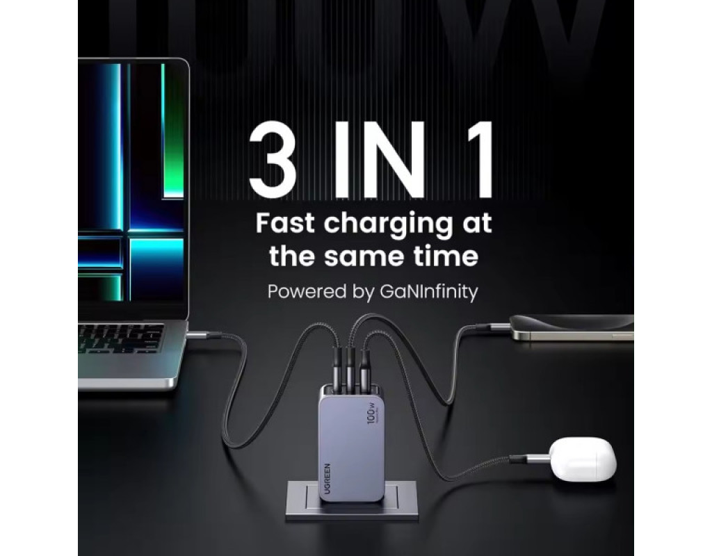 Він оснащений трьома портами: двома USB Type-С та одним USB Type-А. Порт USB Type-С1 підтримує протоколи швидкого зарядження UFCS, PD 3.0, PPS, QC 4+/3+, SCP, FCP, AFC, BC 1.2. та заряджає підключені пристрої з максимальною потужністю 100 Вт, порт USB Type-С2 – з потужністю до 30 Вт, а порт USB Type-А – до 22,5 Вт. При підключенні декількох пристроїв потужність заряджання на кожному порті визначається автоматично. Ugreen 3xUSB 100W GaN (2хUSB-C+USB-A) Nexode Pro X757 дозволяє одночасно заряджати до трьох пристроїв. Новітній чіпсет GaN дозволив виробнику зменшити розмір зарядного пристрою без втрати продуктивності. Зарядний пристрій Ugreen 3xUSB 100W GaN (2хUSB-C+USB-A) Nexode Pro X757 має вбудований захист від короткого замикання, перегріву, перевантаження та від надструмів, тому є безпечним для вас та ваших пристроїв. |