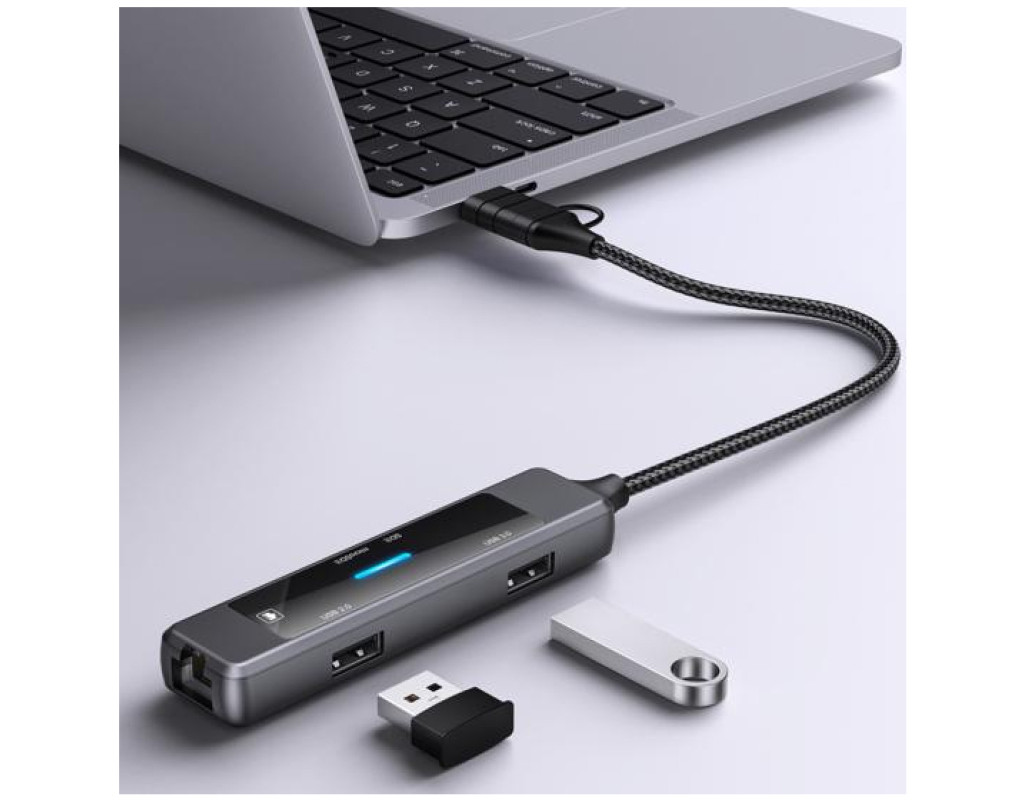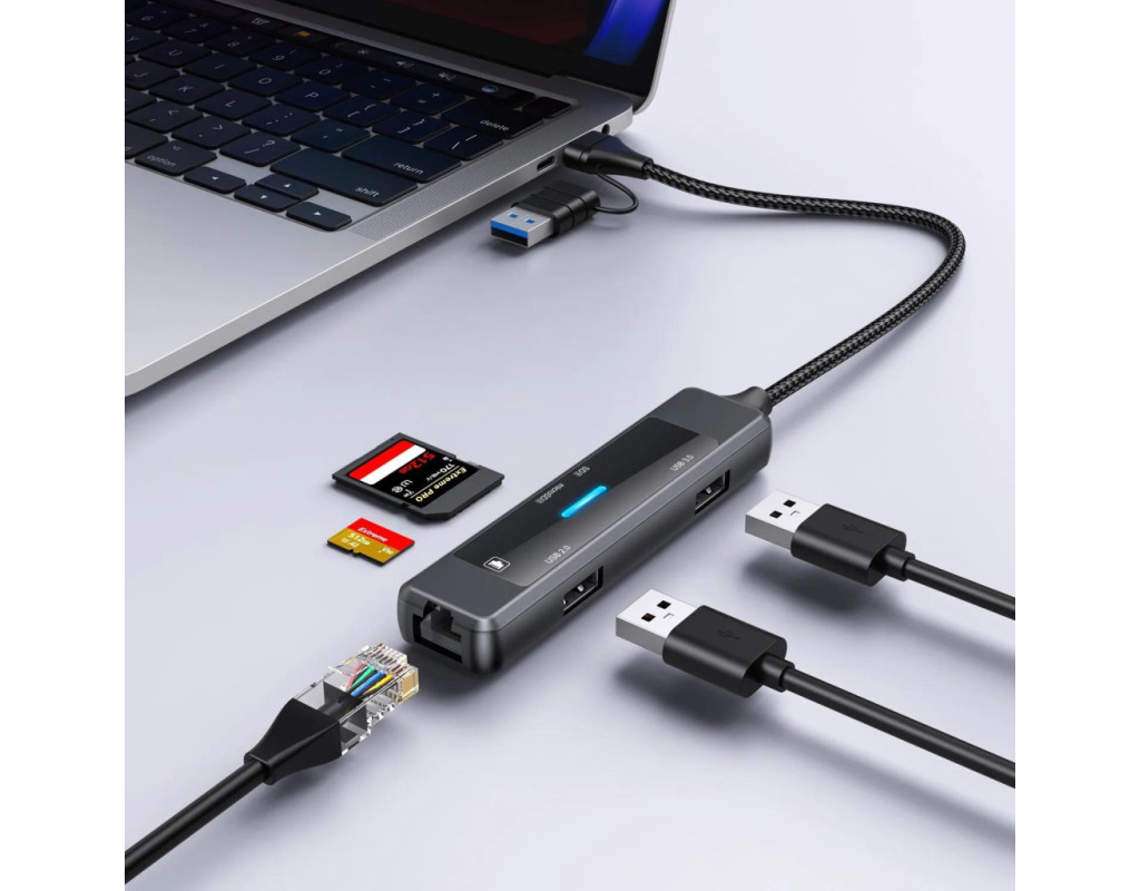 | USB-Type-C хаб адаптер XOKO AC-350 5 в 1 – Ультратонкий дизайн: Цей USB-концентратор для ноутбука може похвалитися ультратонким дизайном, завдяки якому його легко носити з собою, не додаючи пристрою зайвого об’єму. – Високошвидкісна передача даних: Завдяки стандарту USB 3.0 цей концентратор забезпечує швидку передачу даних, підвищуючи вашу продуктивність та ефективність. – Багатопортовий функціонал: Оснащений 5 портами, цей концентратор дозволяє одночасно підключати кілька пристроїв, максимізуючи ефективність вашої роботи. – Можливість швидкої зарядки: зарядний блок хаба з роз’ємом Type-C підтримує швидку зарядку, зменшуючи час простою та покращуючи робочий процес. – Універсальна сумісність: розроблений для універсальної сумісності, цей концентратор можна використовувати з різними пристроями, що робить його універсальним доповненням до вашого технічного арсеналу. – Функціональність RJ45: Концентратор також підтримує функціональність RJ45, додаючи додаткові можливості підключення та збільшуючи його універсальність. Підходить для Microsoft та інших моделей для розширення телефонного порту TYPE-C, може підключатися до USB-накопичувачів, мишок і клавіатур. Читання OTG-карт, керування та перегляд файлів і відео на телефоні. Розширення USB C «п’ять в одному», високошвидкісна передача даних, розширення зовнішніх пристроїв, наприклад, підключення миші, клавіатури або флеш-накопичувача USB. Підтримка читання та запису SD/TF. Підтримує мережевий інтерфейс 100 Мбіт/с, RJ45 100 Мбіт/с. Особливості: Перехідник USB 3.0 на гніздо TYPE C 1. USB 3.0 x 1 2. USB 2.0 x 1 3. SD2.0 + TF2.0 для читання однодискових карт 4. RJ45100Mbs 100Mb мережевий інтерфейс Кабель: 9-жильний металевий плетений кабель з ПВХ, захисний шар з алюмінієвої фольги, що захищає від перешкод Розмір: 9.8×2.4×1.4cm |
