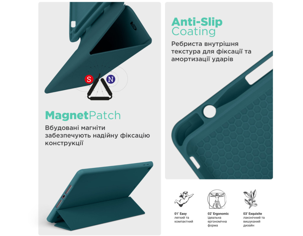 Тип - обкладинка, Сумісність з моделями - Apple iPad Air 11 2024, діагональ - 11, Спосіб кріплення - обкладинка, спосіб закриття - магніт, Матеріал - термополиуретан, штучна шкіра, темно-зелений