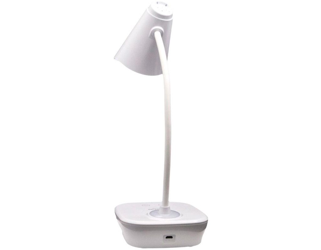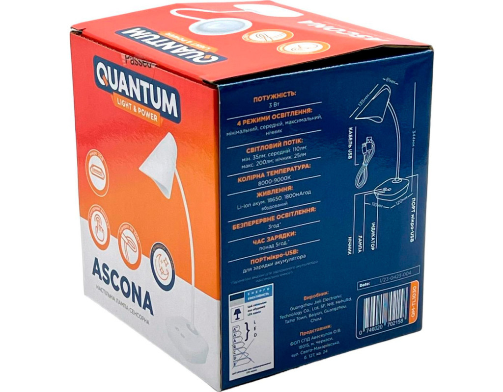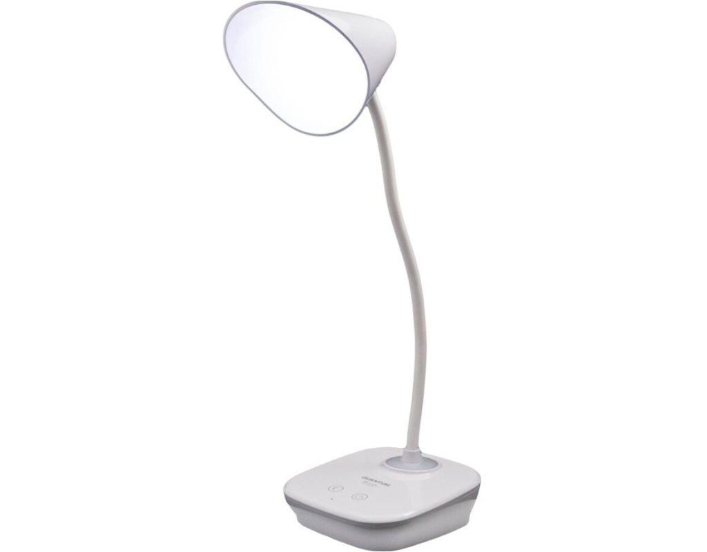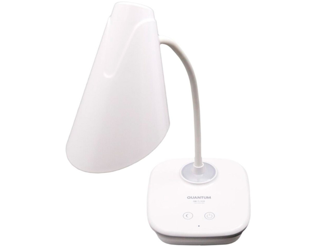 Настільна сенсорна лампа QUANTUM ASCONA QM-TL1030-4K з функцією нічника, оснащена Li-ion акумулятором, для вашого офісу та дому. Лампа висотою 344 мм, виготовлена з ABS пластику, має високу механічну міцність та ударостійкість. Дуже просто і стильна основа. На корпусі розміщений сенсорний вимикач лампи та нічника, порт мікро-USB для зарядки, індикатор заряду. Кабель USB в комплекті. Основні характеристики: