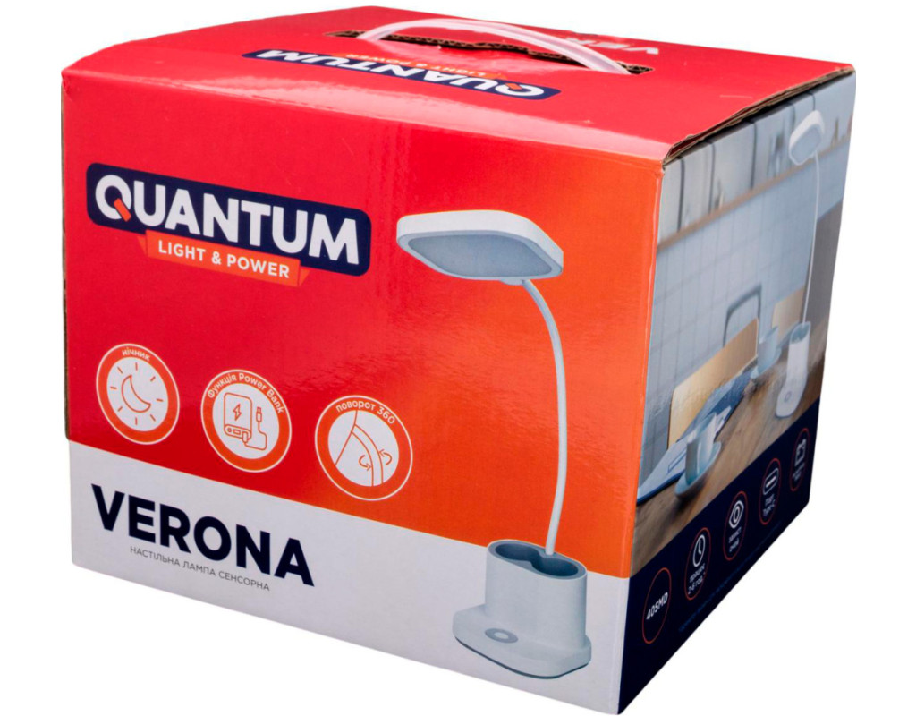 Представляємо стильну та функціональну настільну лампу Quantum QM-TL1062 VERONA із сенсорним керуванням і вбудованою батареєю на 4000 мАг. Це багатофункціональний пристрій, що поєднує освітлення, зарядку пристроїв, функцію нічника та підставки для дрібниць. Лампа обладнана світлодіодним підсвічуванням із можливістю регулювання яскравості та колірної температури, що робить її ідеальним вибором для роботи чи відпочинку. Вона також слугує Power Bank, дозволяючи заряджати мобільні пристрої через USB. Компактний дизайн і додаткові можливості, як-от заміна акумуляторів, роблять цю лампу практичним та довговічним аксесуаром. Основні переваги Quantum QM-TL1062 VERONA