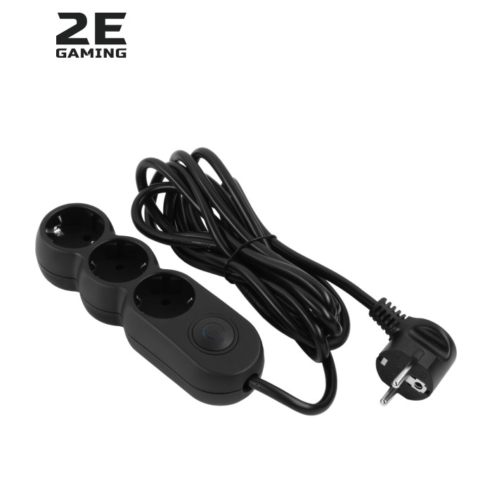 Надійний мережевий подовжувач 2E модель U03VES3MBK особливого дизайну, із заземленням, вимикачем із синім підсвічуванням і захисними шторками. Для вертикального кріплення передбачено отвори. Має три розетки типу Schuko (F). Призначено для побутових і комп’ютерних пристроїв. Колір виробу – чорний, довжина кабелю 3 м.
