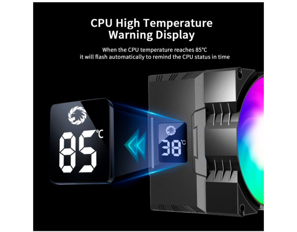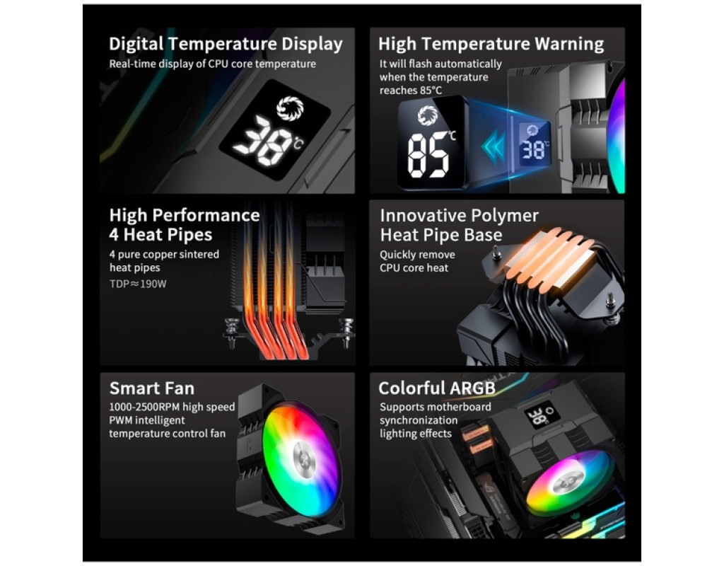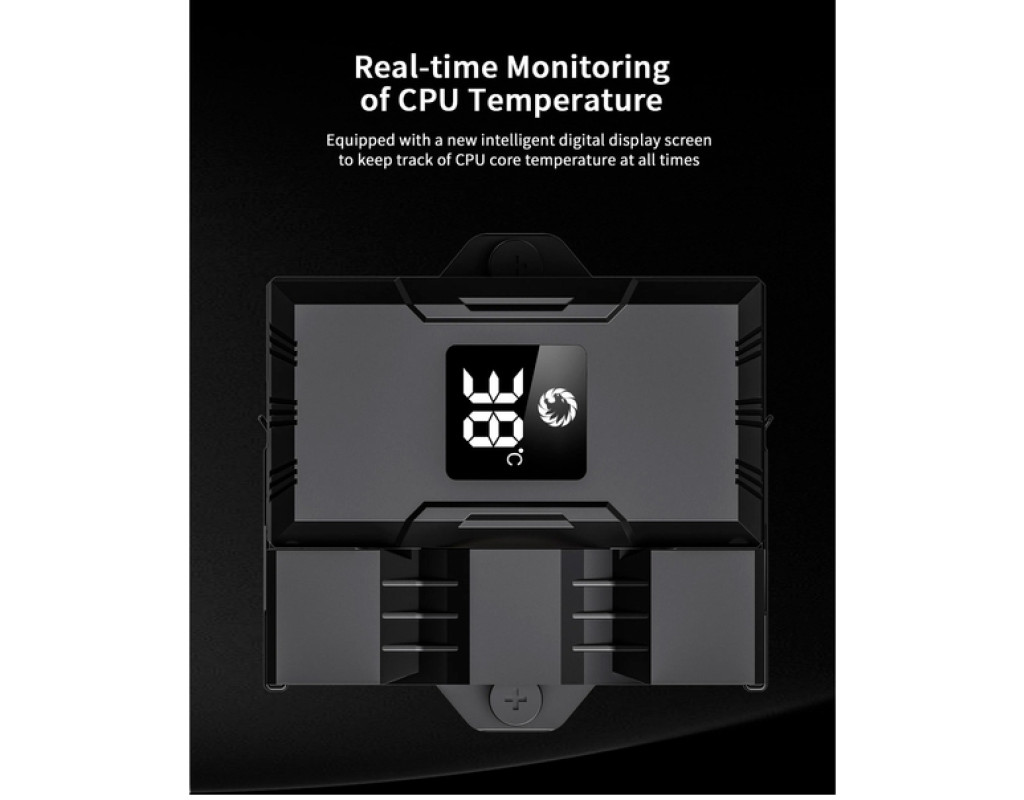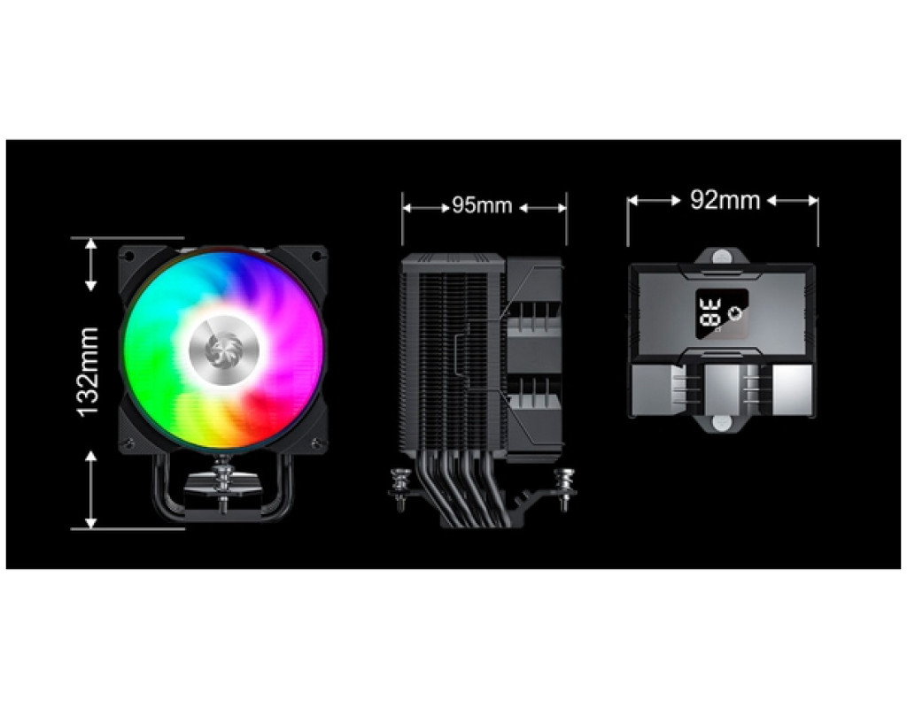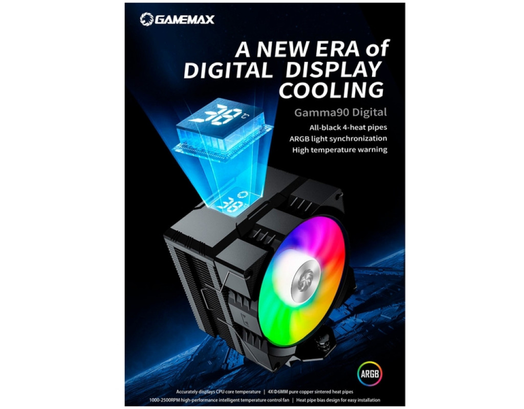 GameMax Gamma 90 Digital — це високоякісний кулер для процесора, який забезпечує ефективне охолодження для сучасних процесорів. Він оснащений чотирма тепловими трубками та підтримує новітні процесори Intel 12-го і 13-го поколінь, а також останні моделі від AMD. Світлові ефекти ARGB додають кулеру стильного вигляду, роблячи його привабливим доповненням до будь-якої системи. Підтримує до 150 Вт, що дозволяє ефективно охолоджувати потужні процесори. Висока швидкість ШІМ становить 1000-2500 об/хв, що дозволяє швидко та ефективно охолодити систему. Завдяки своїм компактним розмірам та висоту всього 132 мм, кулер легко інтегрується у більшість корпусів. Світлові ефекти ARGB додають додатковий шар візуальної привабливості. На дисплеї відображається температура ядра ЦП. Цей кулер допоможе підтримувати оптимальну температуру процесора під час інтенсивних завдань, таких як ігри, редагування відео та робота з графікою, забезпечуючи стабільну та надійну роботу вашої системи. |
