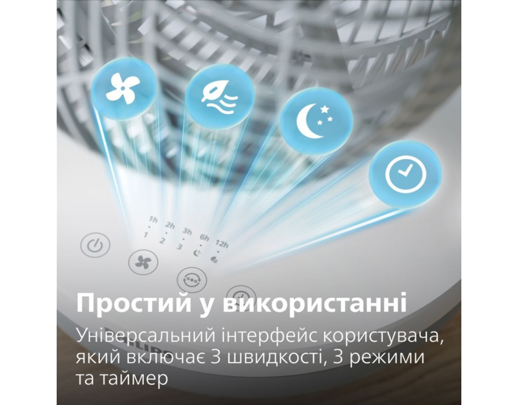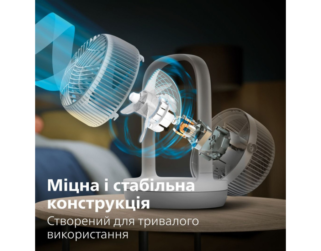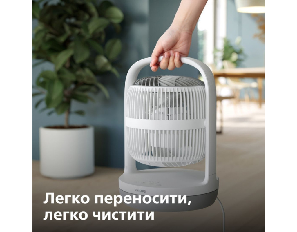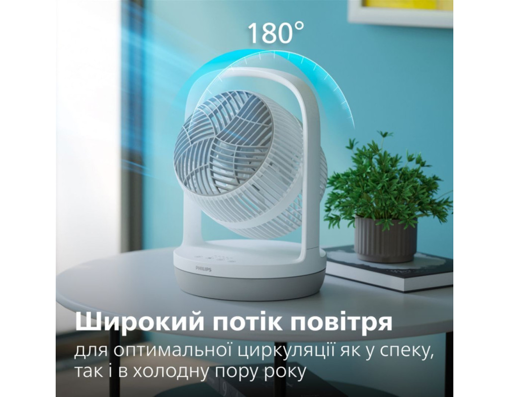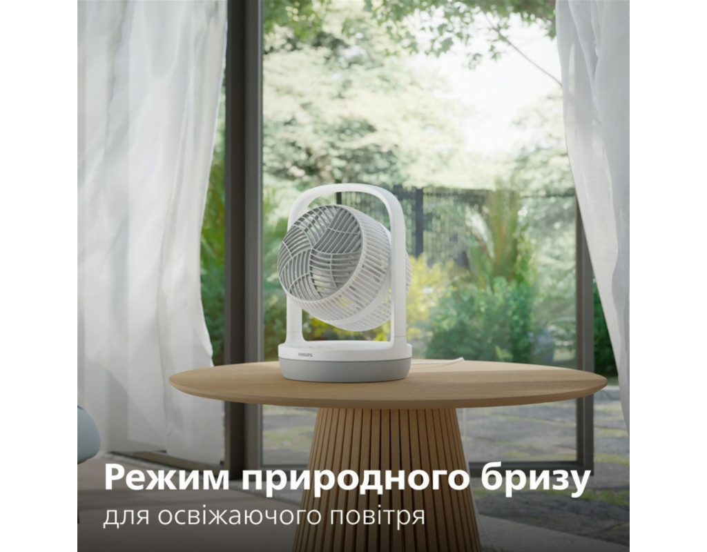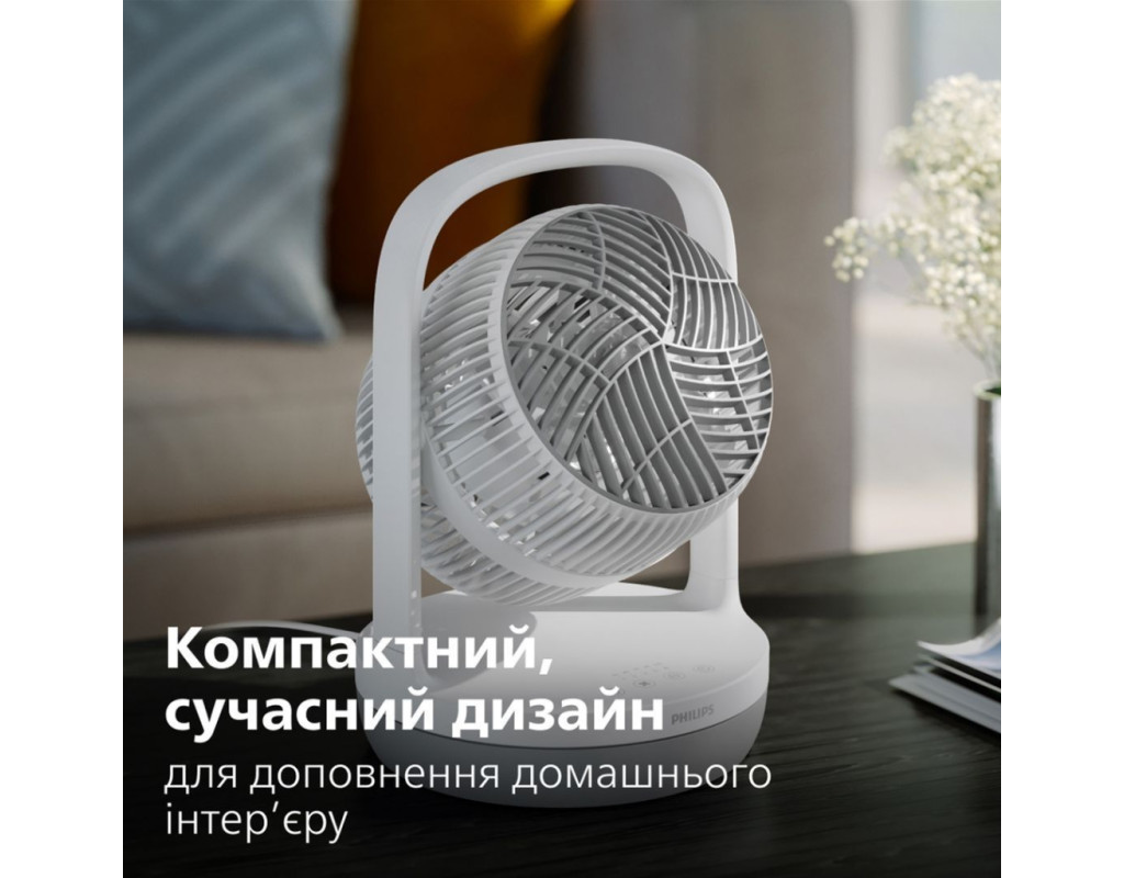 Потужне охолодження, яке ви відчуваєте навіть на відстані Дійсно, вражаючий повітряний потік може досягати 25 метрів. Насолоджуйтесь максимальним комфортом та відчуттям свіжості незалежно від того, де ви знаходитесь; кожен у кімнаті зможе відчути прохолодний вітерець. Достатній потік повітря для циркуляції повітря у всій кімнаті Насолоджуйтесь відчуттям легкого вітерця навколо вас із цим вентилятором-циркулятором повітря, з потужним повітряним потоком 738 м³/год. Попрощайтеся із застійним повітрям, розкрийте джерело свіжого повітря, яке досягатиме кожного куточка вашого простору. Охолодження на 30% тихіше завдяки технології лопат SilentWings На 30% тихіше завдяки інноваційній технології SilentWings. Ця технологія запозичила конструкцію крил у самого тихого птаха - сови, наш дизайн лопатей забезпечує тихіше охолодження з рівнем шуму всього 23 дБ(А) - тихіше шепоту! Створений для тривалого використання, ретельно протестований на якість Створено для тривалого використання, сезон за сезоном. Завдяки більш ніж 80-річному досвіду у догляді за повітрям, Philips проводить понад 110 тестів на своїх вентиляторах перед випуском, забезпечуючи високу якість та продуктивність. Прохолодне повітря протягом всієї ночі завдяки тихому режиму роботи Насолоджуйтесь спокійним безтурботним сном із режимом Quiet Sleep (Тихий сон). Цей режим поступово знижує швидкість вентилятора до мінімальної протягом 30 хвилин, дозволяючи вам спокійно заснути та одночасно заощаджуючи енергію. Режим "Природний вітерець" Режим "Природний вітерець" імітує подих свіжого повітря; інтенсивність і швидкість повітря плавно чергуються від високої до низької, створюючи природне та бадьоре відчуття у приміщенні, яке можна насолоджуватися цілий рік. Індивідуальний комфорт завдяки універсальним режимам Насолоджуйтесь легким вітерцем або потужним потоком повітря з цим універсальним вентилятором, який пропонує 3 швидкісні режими, режим природного вітерця та спокійний режим сну. Виберіть налаштування, яке вам найкраще підходить, відкиньтеся назад і насолоджуйтесь. Регульована голівка для охолодження будь-де Налаштуйте свій рівень комфорту за допомогою вентилятора, який нахиляється на 180°, забезпечуючи освіжаючий повітря саме там, де вам потрібно - будь то пряме охолодження або циркуляція повітря по всій кімнаті. Компактний, сучасний дизайн Легко поєднуючи зручність та простоту, наш вентилятор має вдосконалений дизайн лопатей для чистої та мінімалістичної естетики. Компактний та непомітний, він заощаджує простір, без втрати продуктивністю. Легко переносити та чистити Настільний, компактний дизайн та вражаюча продуктивність. Важить лише 2,3 кг, вентилятор легко переносити, і він однаково зручний як на столі, так і біля вашого ліжка вночі. Крім того, конструкція вентилятора розроблена таким чином, що його досить легко очистити, для цього його слід протерти вологою тканиною. Заощаджуйте до 130 кВт-год на рахунках за електроенергію спожиту кондиціонером Наш вентилятор дозволяє підвищити температуру на термостаті кондиціонера на 5 градусів без втрати комфорту, заощаджуючи до 130 кВт-год на рік, що еквівалентно економії до 35 євро на ваших рахунках за електроенергію. Крім того, він енергоефективний, споживаючи максимум 24 Вт - менше, ніж традиційна лампочка, і в 90 разів менше, ніж стандартний по