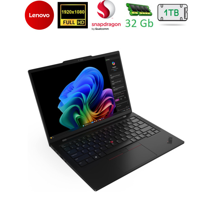 14", 1920x1200 (WUXGA), IPS, Qualcomm Snapdragon X Elite X1E-78-100, 32 ГБ, SSD - 1 ТБ, Adreno GPU, Windows 11 Pro, 58 Втг, підсвічування клавіатури, сканер відбитків пальців, TPM модуль, зарядка від USB, 1.24 кг, чорний