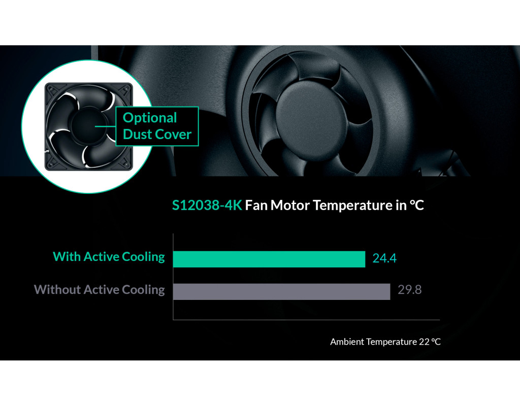 Arctic S12038-4K — корпусний 120-міліметровий вентилятор від відомого виробника. Надійний та міцний, він гарантуватиме продуктивність у різних апаратних середовищах, забезпечить ефективне охолодження та мінімізує час простою. Вентилятор має широкий діапазон швидкостей: від 600 до 4000 обертів на хвилину, якими можна керувати за допомогою ШІМ. Оснащений стандартним 4-контактним роз'ємом, який також дозволяє підключати 2- або 3-контактні роз'єми. Кабель довжиною 30 см забезпечує додаткову гнучкість у розташуванні вентилятора. S12038-4K має статичний тиск 11,45 мм H₂O, що дозволяє проштовхувати повітря навіть через вузькі ребра охолодження. Водночас він досягає максимального повітряного потоку 180 м³/год, що дозволяє йому швидко розсіювати тепло з корпусів. Ці властивості роблять його ідеальним вибором для широкого спектра застосувань. Високоякісний японський подвійний кульковий підшипник забезпечує безперервну роботу 24/7 без найменших компромісів у продуктивності. Пил і висока температура впливають на цей подвійний підшипник набагато менше, ніж на звичайні підшипники або один кульковий підшипник, тому він є ідеальним вибором, коли надійність є важливим показником. |