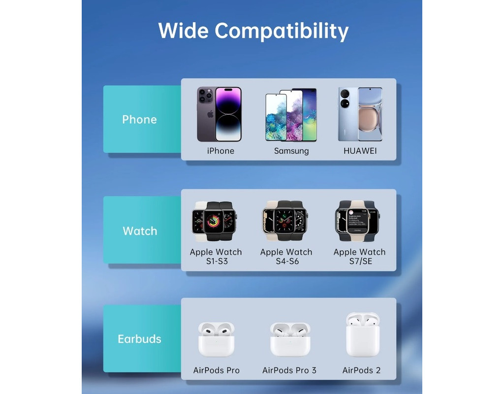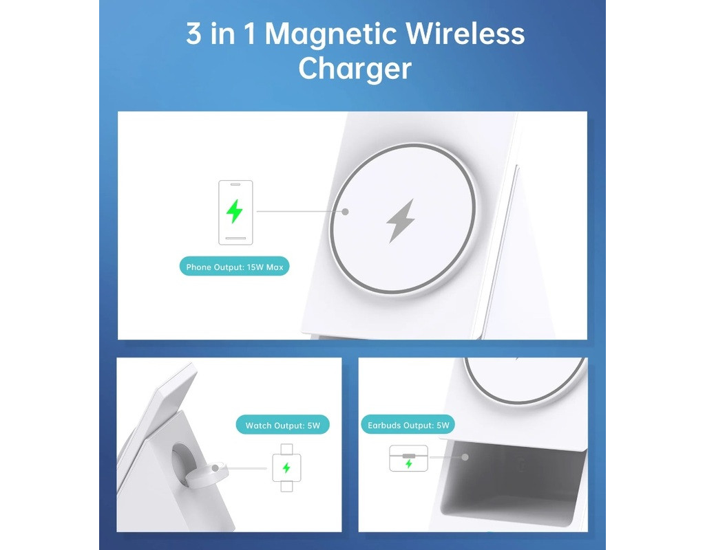 Представляємо Choetech T600 — революційний магнітний бездротовий зарядний пристрій 3-в-1, який зробить використання ваших пристроїв ще зручнішим та ефективнішим. Це поєднання функціональності, елегантності та інновацій. та естетичний дизайн. T600 та підніміть бездротову зарядку на новий рівень! Найважливіші переваги зарядної станції Choetech T600: Цей пристрій 3 в 1 . Choetech T600 може заряджати ваш смартфон, розумний годинник і навушники одночасно, усуваючи необхідність у кількох зарядних пристроях. Забезпечує швидку та ефективну зарядку потужністю до 15 Вт. Він сумісний з Qi . Вихідна потужність: телефон: 15 Вт годинник: 5 Вт навушники: 5 Вт Матеріал: АБС+ПК Тип роз’єму: USB-C Вхідна потужність: 5-9 В/2,2 А білий колір Бездротовий зарядний пристрій 3 в 1 З Choetech T600 ви можете одночасно заряджати свої смартфони, розумний годинник і навушники, що робить його ідеальним рішенням для тих, кому потрібна ефективна зарядка різних пристроїв. Максимальна потужність 15 Вт Потужність 15 Вт означає швидку зарядку Choetech T600 забезпечує достатню потужність для забезпечення повної працездатності всіх ваших пристроїв. Сумісність із пристроями Qi Завдяки сумісності з пристроями Qi Choetech T600 підтримує широкий спектр популярних смартфонів, розумних годинників і навушників. Зарядний пристрій для годинника Виріб оснащений зарядним пристроєм для годинника, який робить зарядку розумного годинника простим і зручним. |