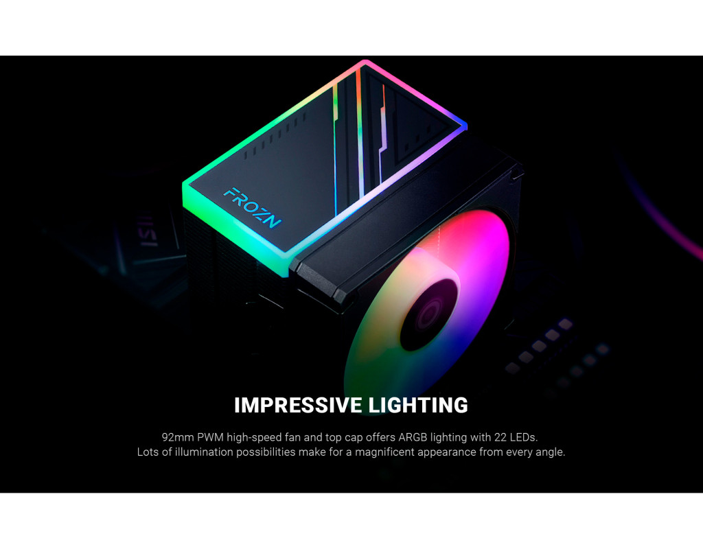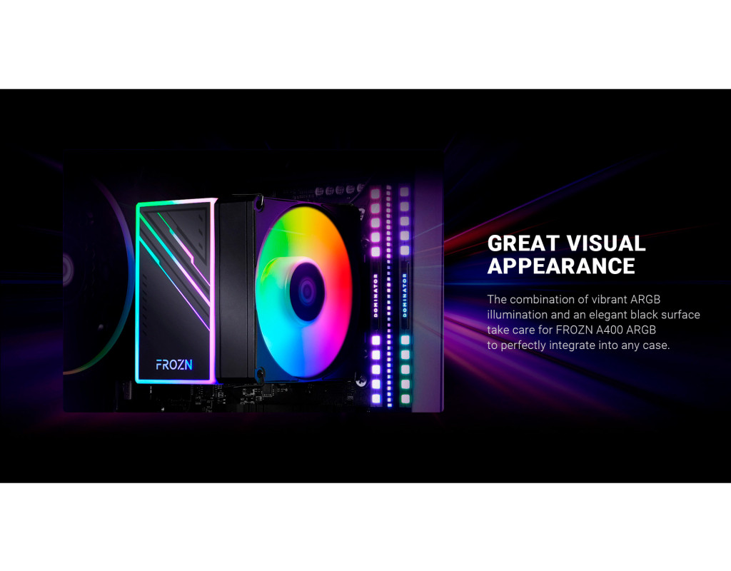 FROZN A400 — кулер для процесора від компанії ID-COOLING. Має 4 теплові трубки та один 92-міліметровий вентилятор з ШІМ, що забезпечує чудове розсіювання тепла від центрального процесора. Оснащений алюмінієвим радіатором, який допомагає швидше охолодити процесор. Теплові трубки з прямим контактом поглинають тепло від ЦП і ефективно поширюють його на радіатор. Спеціальний дизайн мікрохвиль на алюмінієвих ребрах забезпечує краще розсіювання тепла. Також наявна можливість налаштувати швидкість вентилятора відповідно до потреб вашої системи, мінімізуючи шум або максимізуючи потік повітря. Кулер виготовлений зі зносостійкого пластику класичного чорного кольору, також має яскраву підсвітку ARGB, завдяки чому чудово доповнюватиме більшість збірок ПК. A400 забезпечить стабільну та ефективну роботу процесора без перегрівів. |