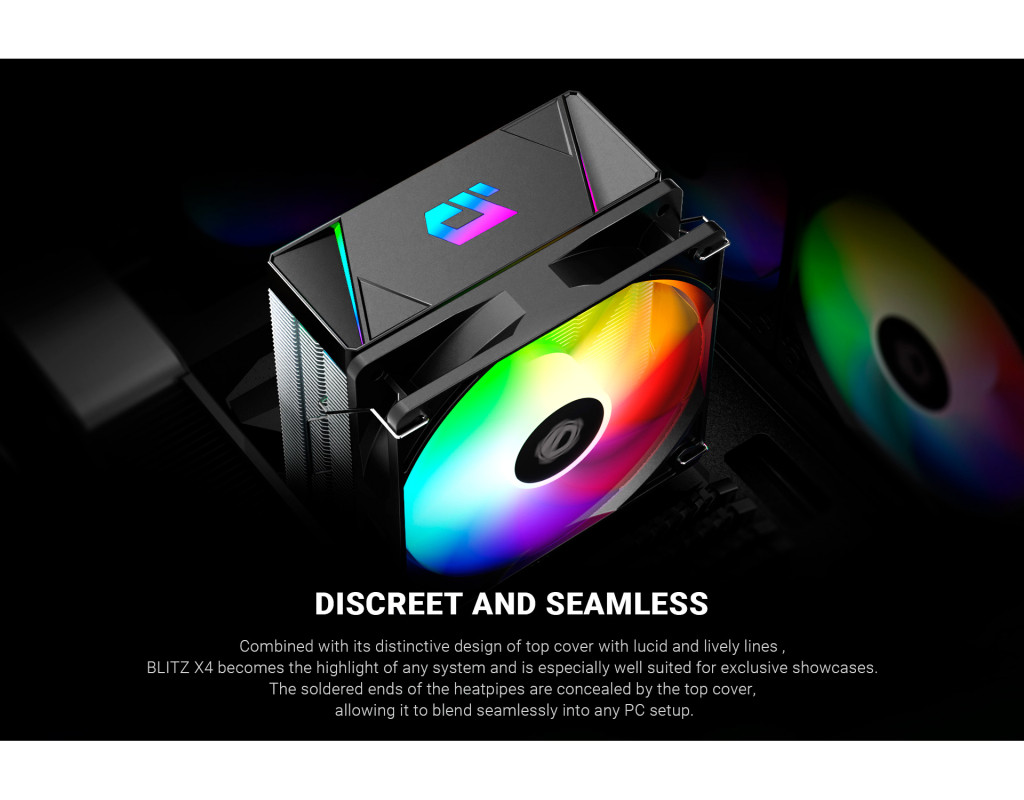 Кулер для процесора від надійного виробника ID-Cooling призначений для охолодження компонентів вашої системи. Верхня кришка має світлодіоди, які світяться яскравими кольорами та вдало доповнюють тиху та потужну роботу компонента. Припаяні кінці теплових трубок приховані верхньою кришкою, що дозволяє бездоганно вписати кулер у будь-яку конфігурацію ПК. Завдяки швидкості повітряного потоку до 64,8 CFM при максимальній швидкості 1500 об/хв. Вентилятор розміром 120 мм з оптимізованою безшумністю забезпечує ідеальний баланс між низьким рівнем шуму, потужним статичним тиском і високим потоком повітря без шкоди для продуктивності. Навіть при 100% швидкості вентилятора загальний рівень шуму становить лише 26,6 дБ(А). BLITZ X4 оснащений чотирма тепловими трубками діаметром 6 мм, які мають технологію Heat pipe Direct Touch. Ця інновація є ключовою для його виняткової ефективності охолодження, оскільки вони передають тепло безпосередньо в оптимальні місця на охолоджувальних ребрах. Завдяки своїй тонкій конструкції товщиною 46 мм він економить простір і забезпечує легкий доступ до банків оперативної пам’яті навіть у тісних межах, доступних деяким компактним корпусам ПК. Завдяки процесу переналагодження та оптимізації монтажного комплекту встановлення та демонтаж тепер ще простіше. Цей кулер розроблений для підтримки широкого спектра роз’ємів, включаючи останні Intel LGA 1851 і AMD AM5. |