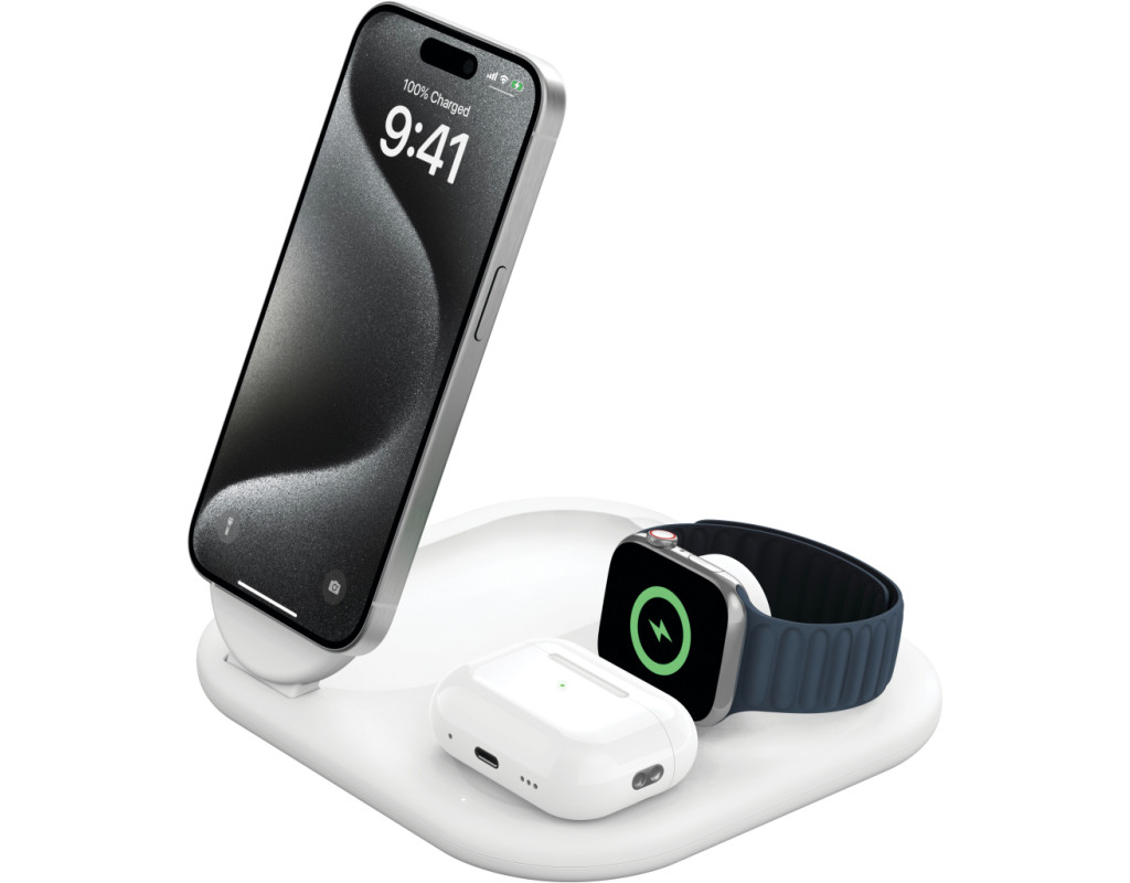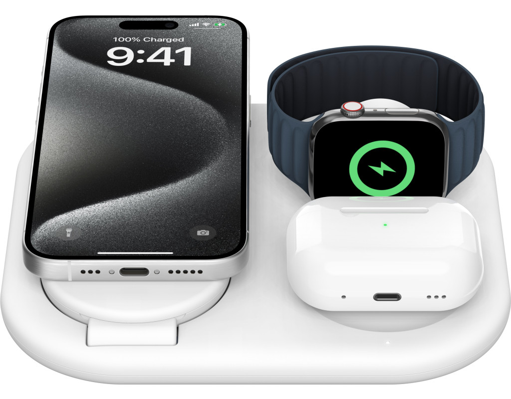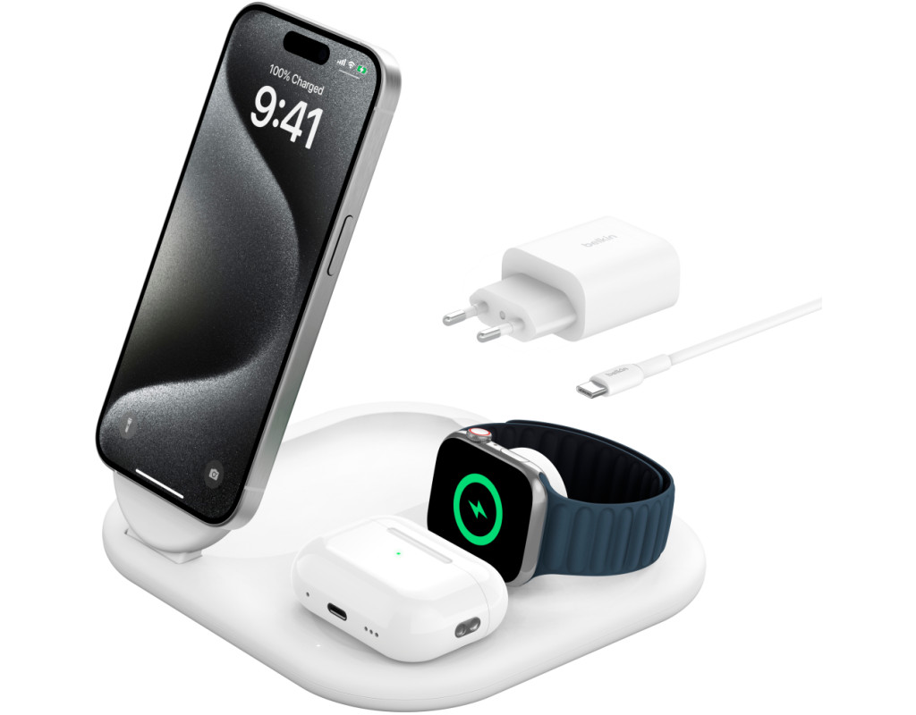 | Belkin 3in1 Magnetic Foldable Charger — ідеальне рішення для швидкого та зручного бездротового заряджання iPhone, Apple Watch і AirPods одночасно. Завдяки технології Qi2, ви отримуєте потужність до 15 Вт для швидкої зарядки, економлячи час. Цей складний зарядний пристрій з магнітним з’єднанням і регульованим кутом нахилу забезпечує комфорт у будь-якій локації, від дому до готелю. Матеріали преміум якості, такі як рідкий кремнієвий каучук та міцний шарнір, гарантують довговічність і безпеку. У комплекті блок живлення на 36 Вт і кабель USB-C. Вироблений з до 75% перероблених матеріалів, Belkin підтримує екологічність без компромісів. Насолоджуйтесь надійністю та якістю з 2-річною гарантією на цей елегантний аксесуар. |