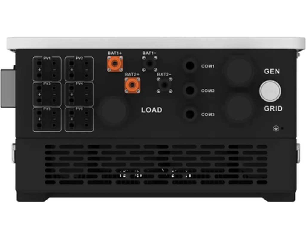 Deye SUN-80K-SG02HP3-EU-EM6 (гібрид: 80 кВт/3ф, батарея HV, MPPT:6) - гібридний трифазний інвертор на 80 кВт з найгнучкішим функціоналом з усіх доступних в Україні інверторів. Інвертор вміє не лише "домішувати" енергію сонячної генерації для зниження власного споживання, але і віддавати надлишки в міську мережу за зеленим тарифом. Можна встановити заборону віддачі енергії до мережі. Інвертор підтримує високовольтне підключення акумуляторних блоків Deye BOS-GM5.1 (HV/51.2V/104Ah/5.3kWh/LiFePO4) в діапазоні 160-1000В. Так само в системі необхідно використання блоку управління кластером батарей Deye HVB750V/100A-EU, який синхронізує роботу з акумуляторним блоком, отримуючи дані про ємність, залишок заряду, необхідний струм зарядки, температуру. До цього інвертора можна підключати 2 акумуляторні кластери з зарядним струмом по 80А на кожен вхід кластер. Інвертор може заряджати акумуляторні блоки за розкладом. Deye SUN-80K-SG02HP3-EU-EM6 має відмінну особливість від аналогічних інверторів, в ньому вбудований додатковий силовий порт, який може бути як входом так і виходом. І має три варіанти використання: