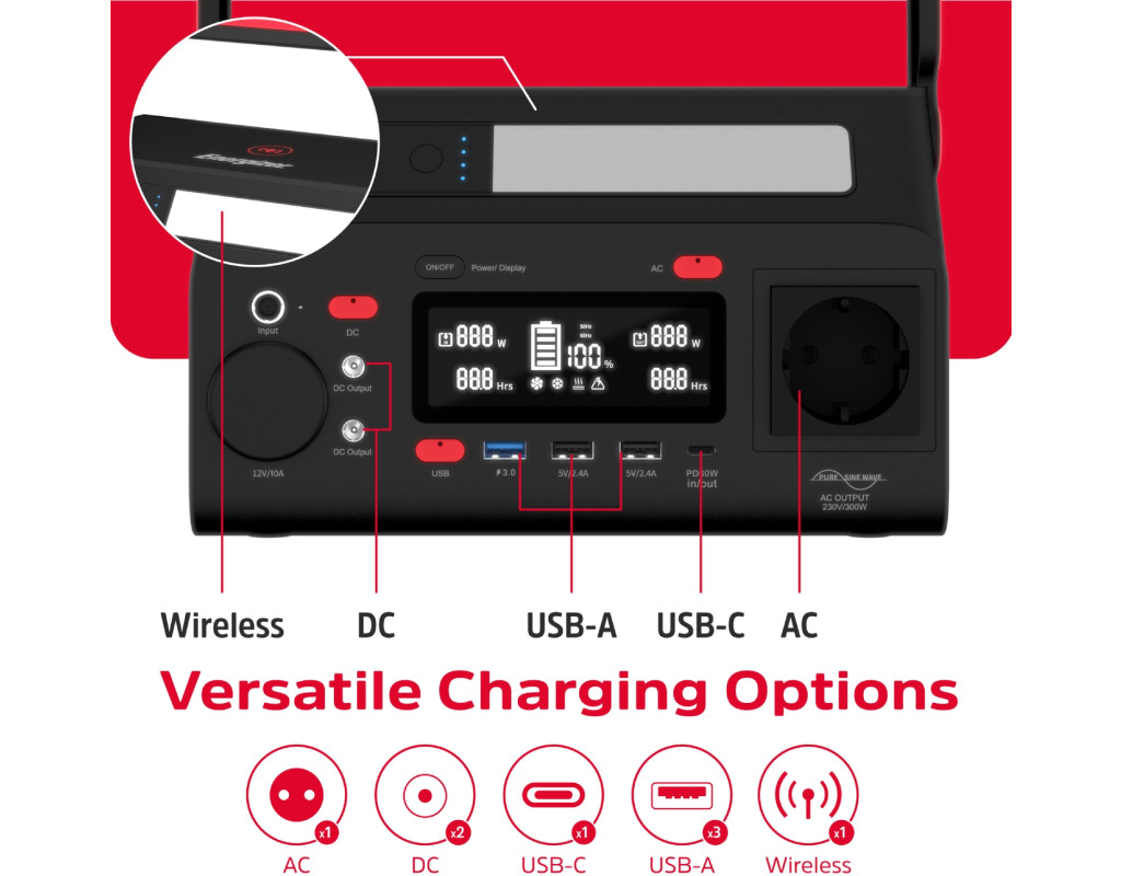 1 × AC, 2 × DC (12В/10А), 1 х Гніздо прикурювача (12В/10А), 1 x USB-C(макс. 60 Вт), 3 x USB-A, Бездротовий вихід (5В/10В) |