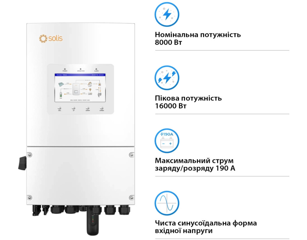 гібридний, 1 фаза, Потужність інвертора (активна) - 8 кВт, 335 х 560 х 227 мм