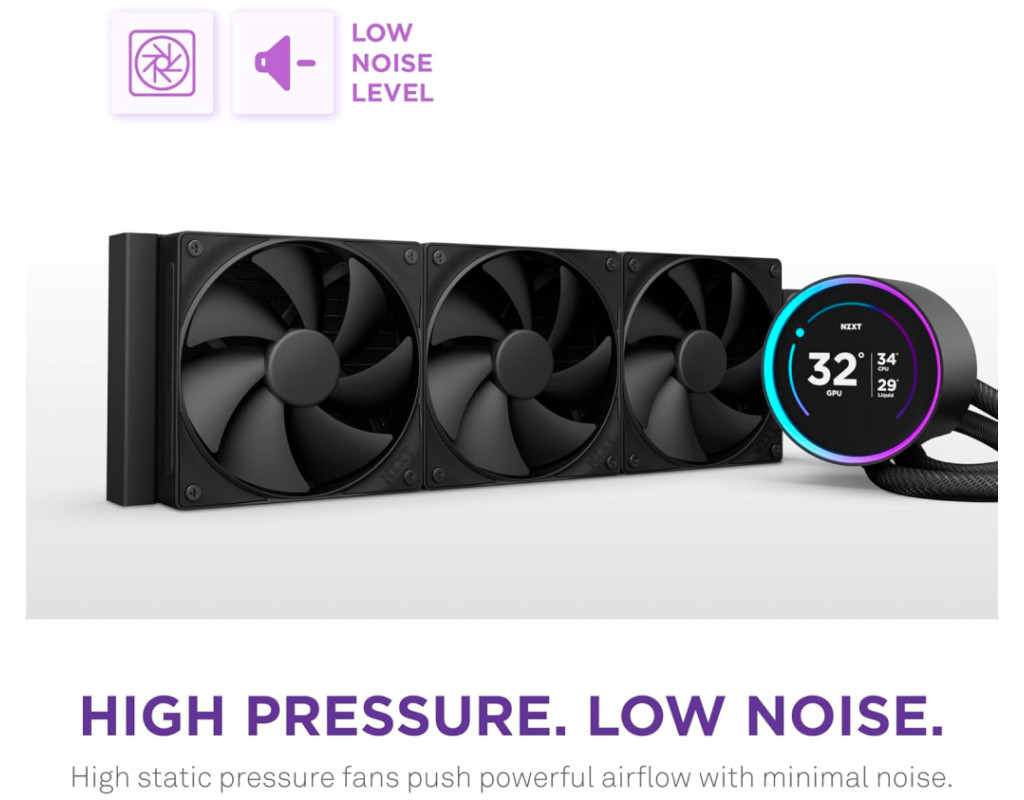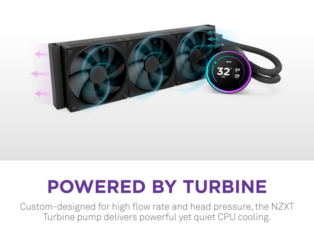 Оновлений Kraken Elite оснащений спеціально розробленим насосом NZXT Turbine, який забезпечує чудовий 10-відсотковий* приріст продуктивності охолодження центрального процесора. Приголомшливий 2.72-дюймовий IPS-екран з динамічним RGB-кільцем пропонує безмежні можливості персоналізації, роблячи Kraken Elite привабливим центром уваги для будь-якої збірки. Спеціально розроблена турбінна помпа NZXT Turbine забезпечує високу швидкість потоку та високий тиск для потужного, але тихого охолодження процесора.