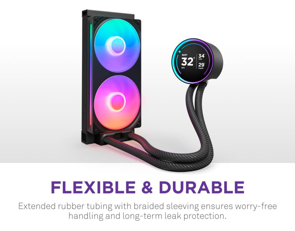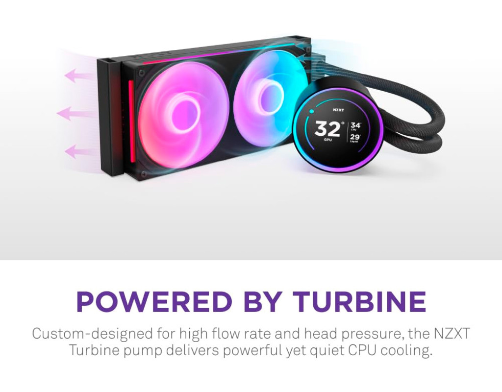 Оновлений Kraken Elite оснащений спеціально розробленим насосом NZXT Turbine, який забезпечує чудовий 10-відсотковий* приріст продуктивності охолодження центрального процесора. Приголомшливий 2.72-дюймовий IPS-екран з динамічним RGB-кільцем пропонує безмежні можливості персоналізації, роблячи Kraken Elite привабливим центром уваги для будь-якої збірки. Спеціально розроблена турбінна помпа NZXT Turbine забезпечує високу швидкість потоку та високий тиск для потужного, але тихого охолодження процесора.