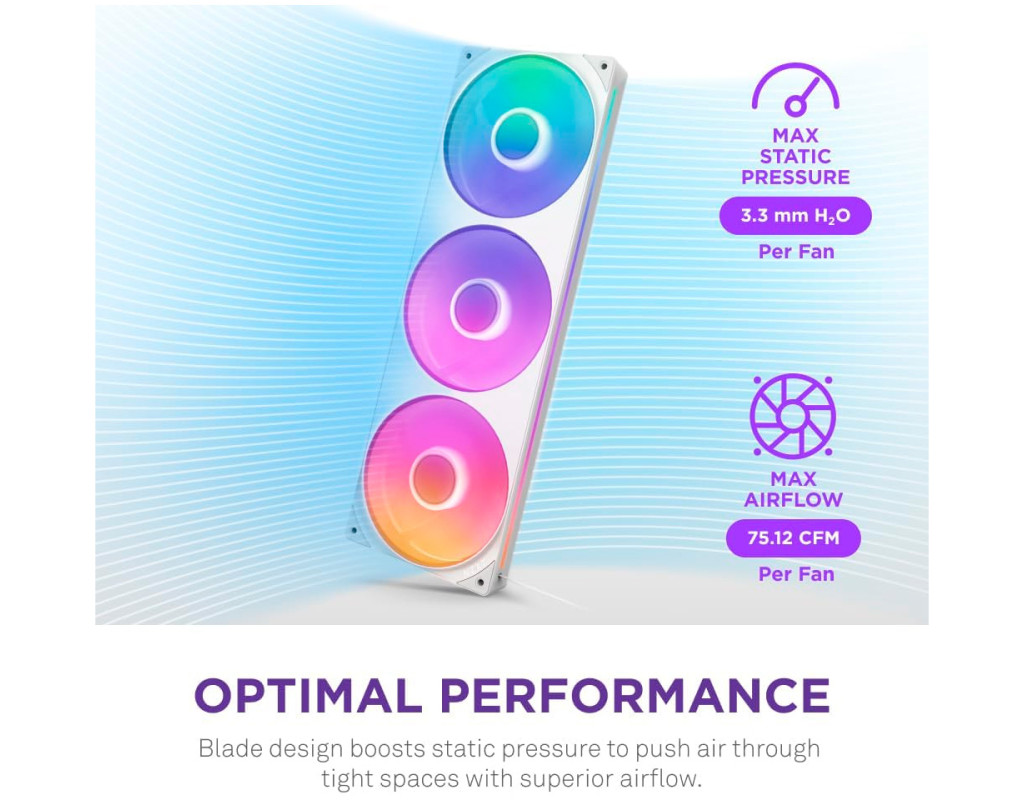 NZXT F360 RGB Core — надійний кулер для корпуса, призначений для охолодження компонентів ПК. Вентилятори RGB серії F забезпечують чудове освітлення завдяки восьми світлодіодам RGB з окремою адресацією та преміальне охолодження з високим статичним тиском. Удосконалена конструкція втулки та лопатей забезпечує підвищений статичний тиск, проштовхуючи повітря через радіатор, одночасно забезпечуючи чудовий потік. ШІМ-керований вентилятор дозволяє регулювати швидкість, щоб ви отримали найкраще охолодження. Підшипник Fluid Dynamic гарантує високу стабільність обертання, одночасно зменшуючи шум і збільшуючи термін служби вентилятора до 60 000 годин. Антивібраційні гумові куточки гасять вібраційний шум на будь-якій швидкості. |