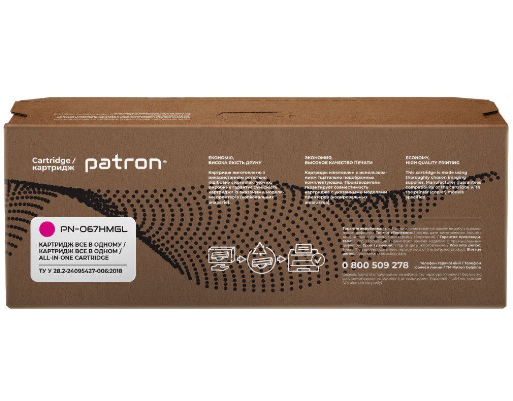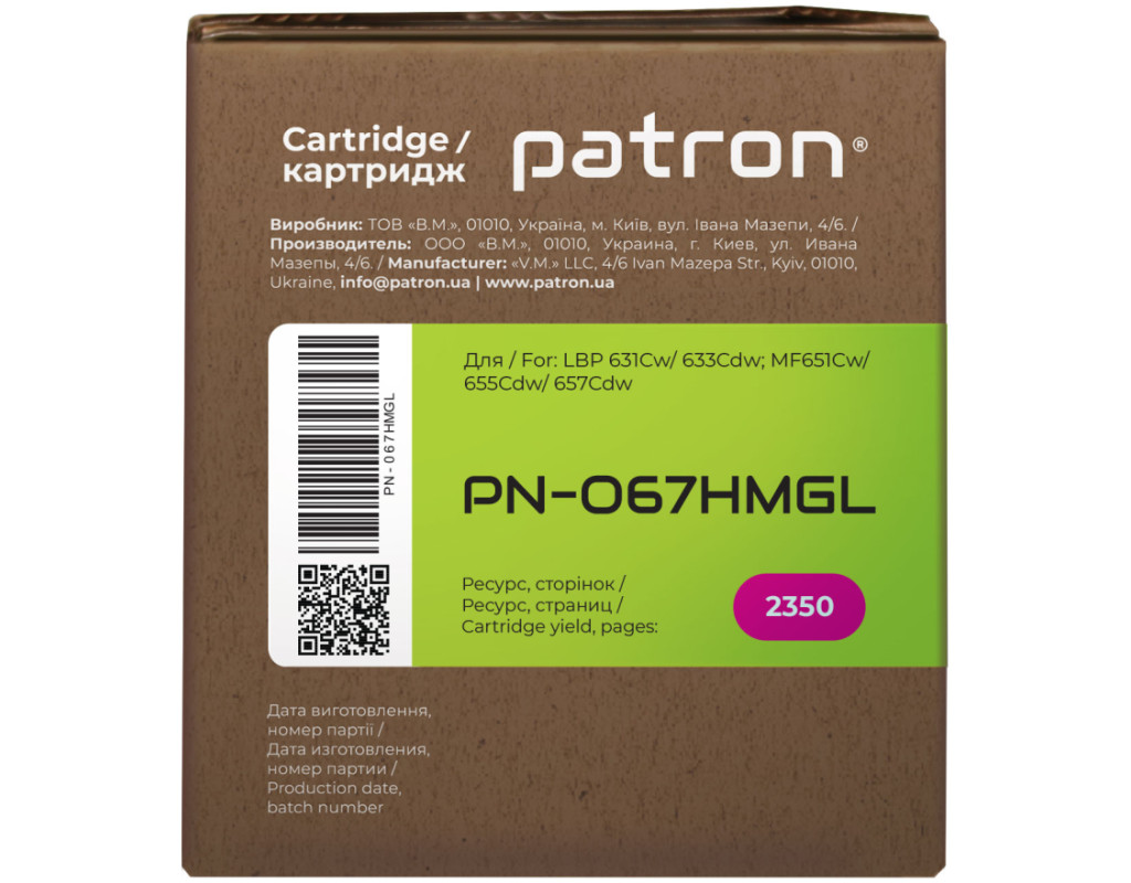 | Картридж сумісний Canon 067H жовтий Green Label Patron (PN-067HYGL) оптимальне рішення для лазерних принтерів та БФП. Основні властивості Детальна інформація: Що таке сумісний картридж? Кожен користувач друкувальної техніки стикається з питанням купівлі нового картриджа і знаходить досить велику кількість пропозицій. Як зробити правильний вибір? Розглянемо основні варіанти: Виробники друкувальних пристроїв (т.з. OEM виробники) наполягають на використанні оригінальних картриджів. Їх основний недолік - висока вартість. Сумісні картриджі виробляються різними компаніями - сторонніми виробниками. Вони дають можливість істотно заощадити на друці, проте питання оптимального балансу між якістю друку, ціною, гарантією та ресурсом картриджа залишається вибором Покупця. Картридж сумісний Canon 067H жовтий Green Label Patron (PN-067HYGL) гарантія Ми гарантуємо 12 місяців справної роботи картриджа та проведемо заміну продукції з виробничим дефектом. Якість друку Картриджі серії Patron Green Label виготовляються з використанням нових корпусів та повністю придатні для повторної заправки. Основна відміна серії Patron Green Label від картриджів низького цінового сегменту – якість комплектуючих, що забезпечує високу оптичну щільність друку, а також ресурс, аналогічний оригінальному картриджу. При виробництві картриджів Patron Green Label виробник дотримується загального стандарту ISO 9001:2015 і спеціальні стандарти, що використовуються в індустрії друку - ISO 19752:2017 для монохромних картриджів ISO 19798:2017 - для кольорових картриджів, а також STMC стандарт для контролю ресурсу. Захист навколишнього середовища Виробництво картриджів Patron Green Label відбувається з виконанням вимог міжнародного стандарту по захисту навколишнього середовища - ISO 14001:2015. Залишки матеріалів і комплектуючих, що використовуються для виробництва картриджів Patron Green Label, передаються на утилізацію відповідно Закону України "Про відходи". Для виробництва картонної упаковки ми використовуємо перероблені матеріали з нанесенням мінімальної кількості фарби. А конструкція коробки для картриджа дозволяє кілька разів відкривати і закривати його на "замок" для транспортування в сервісний центр. Ми закликаємо до нанесення мінімального впливу на довкілля. Тому заправляйте і відновлюйте картриджі Patron Green Label. Картридж сумісний Canon 067H жовтий Green Label Patron (PN-067HYGL) економія на офісному друці Вартість картриджів серії Patron Green Label в середньому на 70-80% нижче оригінальних витратних матеріалів. Оптимальне співвідношення ціна-якість робить дану продукцію хорошим вибором для Клієнтів, що бажають заощадити на друці і не прогадати з якістю. Зовнішній вигляд Ми потурбувалися про те, щоб упаковка картриджа була не лише екологічною, функціональною, мала мінімально можливі фізичні розміри, але і містила усю необхідну інформацію. На зеленій етикетці знаходиться інформація про картридж, його сумісність з друкувальними пристроями, номер партії, дата виготовлення, контакти виробника, а також номер телефону безкоштовної гарячої лінії для українських споживачів. Сподіваємось, що наведена інформація дозволить Вам зробити правильний вибір. Ваш друк – наша турбота! Оптимальний варіант для користувача, що хоче заощадити;При виробництві картриджа використовується новий корпус;Гарантований ресурс;Економія 70-80% у порівнянні з оригінальними витратними матеріалами;