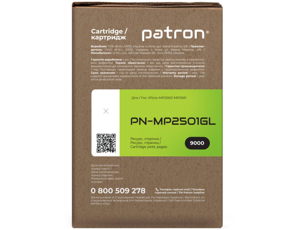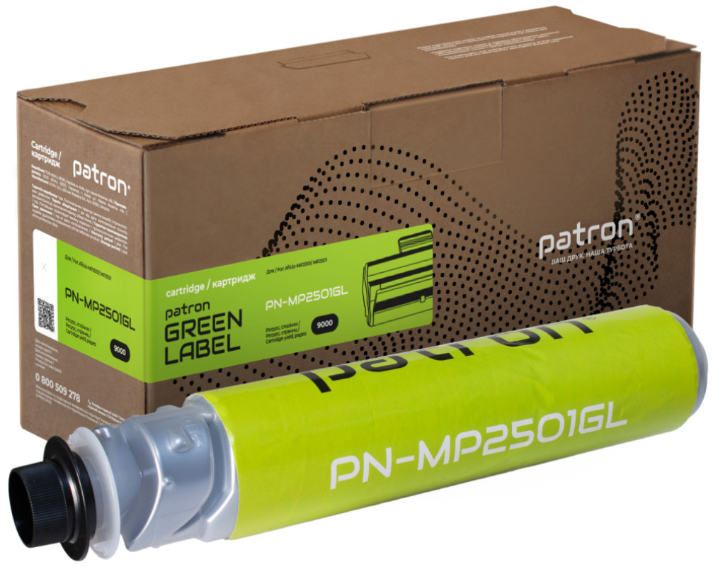 | Тонер-картридж сумісний Ricoh MP2501 Green Label Patron (PN-MP2501GL) оптимальне рішення для лазерних принтерів та БФП. Основні властивості Детальна інформація: Що таке сумісний картридж? Кожен користувач друкувальної техніки стикається з питанням купівлі нового картриджа і знаходить досить велику кількість пропозицій. Як зробити правильний вибір? Розглянемо основні варіанти: Виробники друкувальних пристроїв (т.з. OEM виробники) наполягають на використанні оригінальних картриджів. Їх основний недолік - висока вартість. Сумісні картриджі виробляються різними компаніями - сторонніми виробниками. Вони дають можливість істотно заощадити на друці, проте питання оптимального балансу між якістю друку, ціною, гарантією та ресурсом картриджа залишається вибором Покупця. Тонер-картридж сумісний Ricoh MP2501 Green Label Patron (PN-MP2501GL) гарантія Ми гарантуємо 12 місяців справної роботи картриджа та проведемо заміну продукції з виробничим дефектом. Якість друку Картриджі серії Patron Green Label виготовляються з використанням нових корпусів та повністю придатні для повторної заправки. Основна відміна серії Patron Green Label від картриджів низького цінового сегменту – якість комплектуючих, що забезпечує високу оптичну щільність друку, а також ресурс, аналогічний оригінальному картриджу. При виробництві картриджів Patron Green Label виробник дотримується загального стандарту ISO 9001:2015 і спеціальні стандарти, що використовуються в індустрії друку - ISO 19752:2017 для монохромних картриджів ISO 19798:2017 - для кольорових картриджів, а також STMC стандарт для контролю ресурсу. Захист навколишнього середовища Виробництво картриджів Patron Green Label відбувається з виконанням вимог міжнародного стандарту по захисту навколишнього середовища - ISO 14001:2015. Залишки матеріалів і комплектуючих, що використовуються для виробництва картриджів Patron Green Label, передаються на утилізацію відповідно Закону України "Про відходи". Для виробництва картонної упаковки ми використовуємо перероблені матеріали з нанесенням мінімальної кількості фарби. А конструкція коробки для картриджа дозволяє кілька разів відкривати і закривати його на "замок" для транспортування в сервісний центр. Ми закликаємо до нанесення мінімального впливу на довкілля. Тому заправляйте і відновлюйте картриджі Patron Green Label. Тонер-картридж сумісний Ricoh MP2501 Green Label Patron (PN-MP2501GL) економія на офісному друці Вартість картриджів серії Patron Green Label в середньому на 70-80% нижче оригінальних витратних матеріалів. Оптимальне співвідношення ціна-якість робить дану продукцію хорошим вибором для Клієнтів, що бажають заощадити на друці і не прогадати з якістю. Зовнішній вигляд Ми потурбувалися про те, щоб упаковка картриджа була не лише екологічною, функціональною, мала мінімально можливі фізичні розміри, але і містила усю необхідну інформацію. На зеленій етикетці знаходиться інформація про картридж, його сумісність з друкувальними пристроями, номер партії, дата виготовлення, контакти виробника, а також номер телефону безкоштовної гарячої лінії для українських споживачів. Сподіваємось, що наведена інформація дозволить Вам зробити правильний вибір. Ваш друк – наша турбота! Оптимальний варіант для користувача, що хоче заощадити;При виробництві картриджа використовується новий корпус;Гарантований ресурс;Економія 70-80% у порівнянні з оригінальними витратними матеріалам