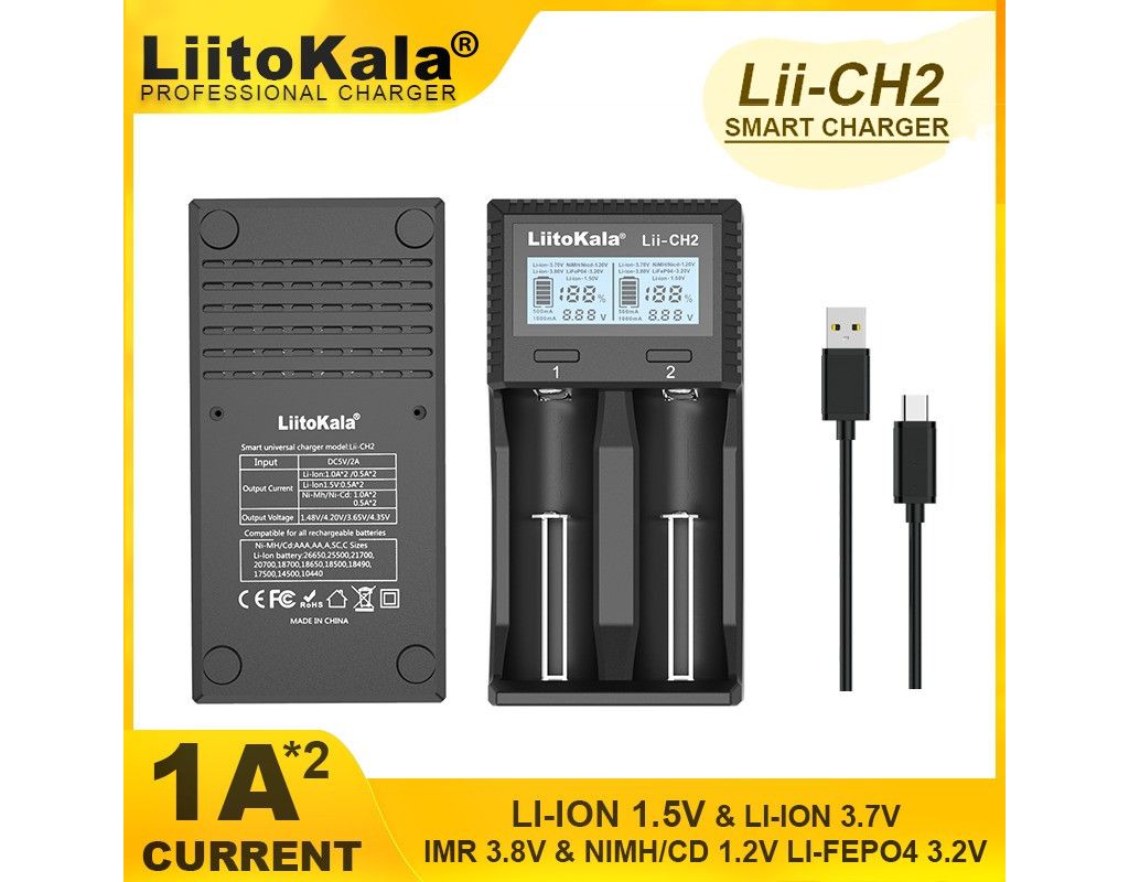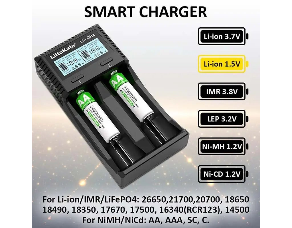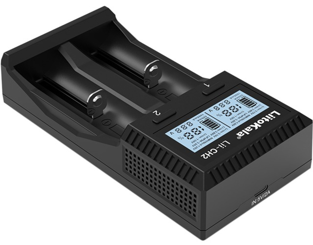 | Універсальний зарядний пристрій для пальчикових нікель-металогідридних та літієвих акумуляторів від компанії Liitokala. Перший "всеїдний" зарядний пристрій, який крім всіх відомих типів дозволяє заряджати нові літій-іонні 1.5В акумулятори. Є захист від переполюсування та функція активації розряджених батарей.