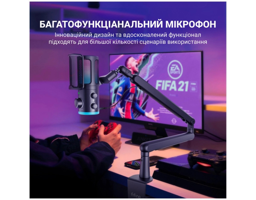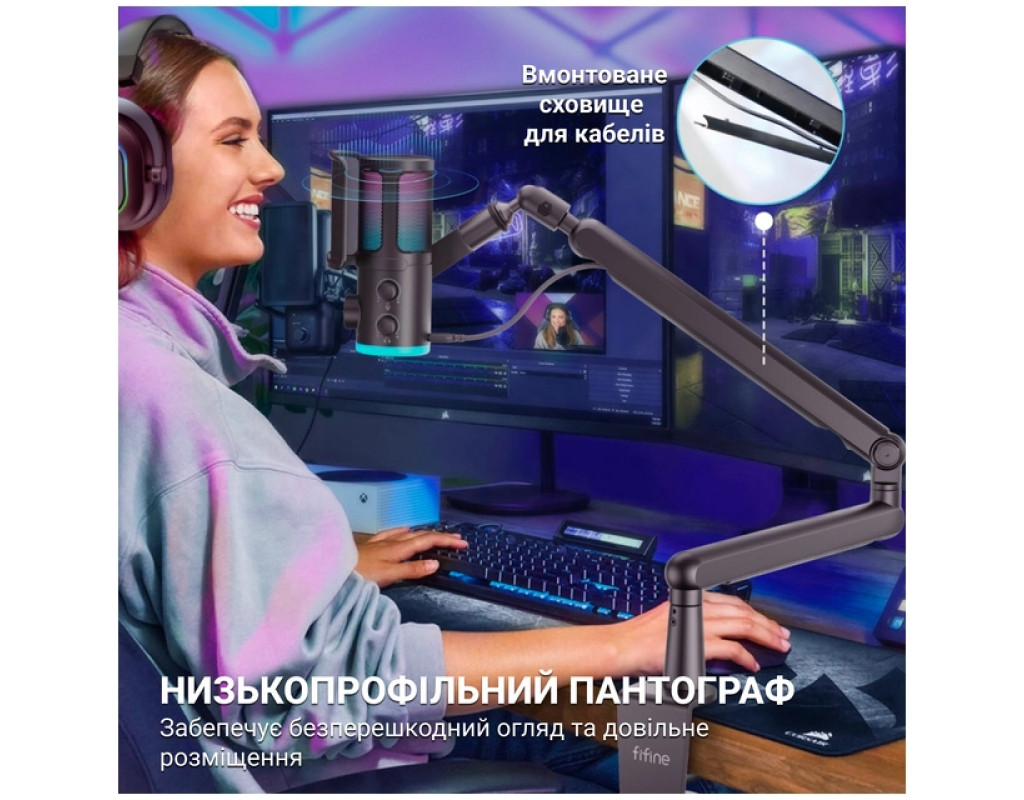 Fifine TAM6 — студійний конденсаторний USB-мікрофон з активним шумозаглушенням з пантографом. Стане чудовим вибором для користувачів, яким важливий чистий та якісний звук для стріму, геймінгу, подкасту, вокалу/озвучування, інтервʼю, ASMR тощо.