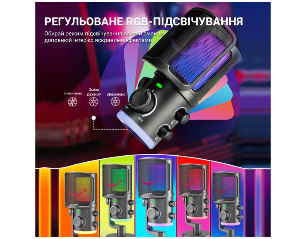 Fifine TAM6 з RGB-підсвічуванням відкриває перед вами безмежні можливості для створення унікальної атмосфери у вашому студійному просторі. Цей мікрофон пропонує три режими підсвічування, що дозволяють налаштовувати атмосферу згідно з вашим настроєм та типом контенту, який ви створюєте.
