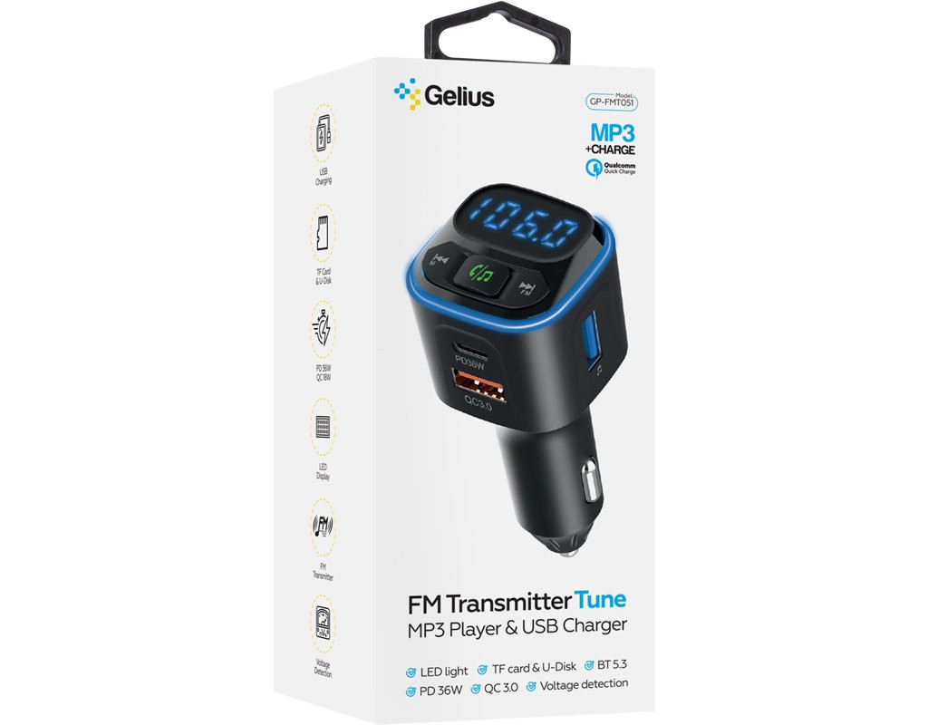 | Програвання музики з різних джерел FM модулятор Gelius Tune дозволяє насолоджуватися улюбленою музикою з різних джерел. Ви можете підключити смартфон або інший пристрій через Bluetooth 5.3, використовувати флешку до 64 Гб або MicroSD карту до 32 Гб. Крім цього, модулятор підтримує FM радіо в діапазоні частот від 87.5 до 108 МГц. Бездротове підключенняЗавдяки Bluetooth 5.3, ви зможете легко підключити свій смартфон або інший пристрій до модулятора. Це забезпечує стабільне з'єднання і високу якість звуку без використання дротів. Зарядка двох пристроїв одночасноFM модулятор Gelius Tune оснащений портами USB-A та USB Type-C, які підтримують швидку зарядку. Порт USB-A забезпечує Quick Charge 18W, а порт USB Type-C - Power Delivery 36W. При одночасному використанні обидва порти видають загальну потужність 5V/3A, що дозволяє заряджати два пристрої одночасно з високою швидкістю. Технологія PPSМодулятор оснащений технологією PPS (Programmable Power Supply), яка забезпечує оптимальну потужність зарядки для ваших пристроїв, зменшуючи тепловиділення і підвищуючи ефективність. Вбудований мікрофонGelius Tune має вбудований мікрофон, що дозволяє відповідати на дзвінки або викликати голосового помічника Siri або Google, не відволікаючись від керування автомобілем. Це робить вашу поїздку безпечнішою і комфортнішою. Модулятор виглядає стильно завдяки LED підсвітці по контуру та дисплею. |