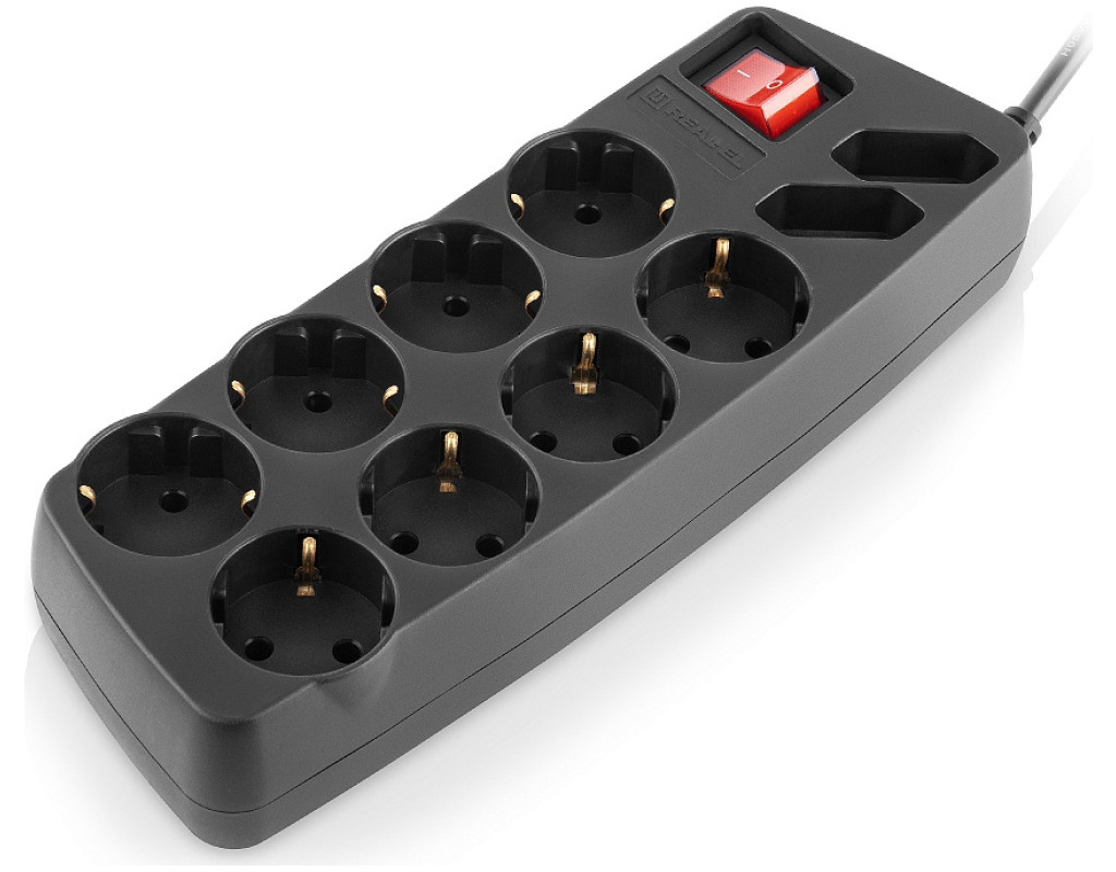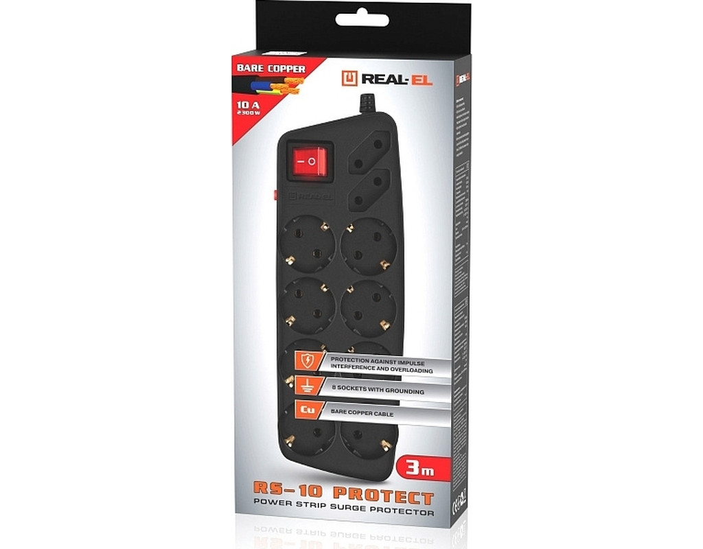 Мережевий фільтр-подовжувач REAL-EL RS-10 PROTECT – стиль, надійність і турбота про ваш комфорт. Він поєднує сучасний дизайн із практичною функціональністю, даруючи впевненість у кожному підключенні. Корпус із термостійкого пластика, продумана система захисту та якісний кабель гарантують довговічність і безпеку. Фільтр дозволяє підключити до десяти приладів одночасно: вісім розеток із заземленням та дві додаткові компактні пласкі розетки забезпечують універсальність використання. Зручна двополюсна кнопка живлення зі світловою індикацією дозволяє легко керувати підключеними пристроями. Оснащений багаторазовим біметалічним термозапобіжником, фільтр забезпечує додатковий захист від перевантажень і перегріву. Для ще більшої зручності передбачена можливість настінного кріплення, що економить простір і додає комфорту у використанні. REAL-EL RS-10 PROTECT – ваш надійний помічник у захисті та живленні техніки. Особливості