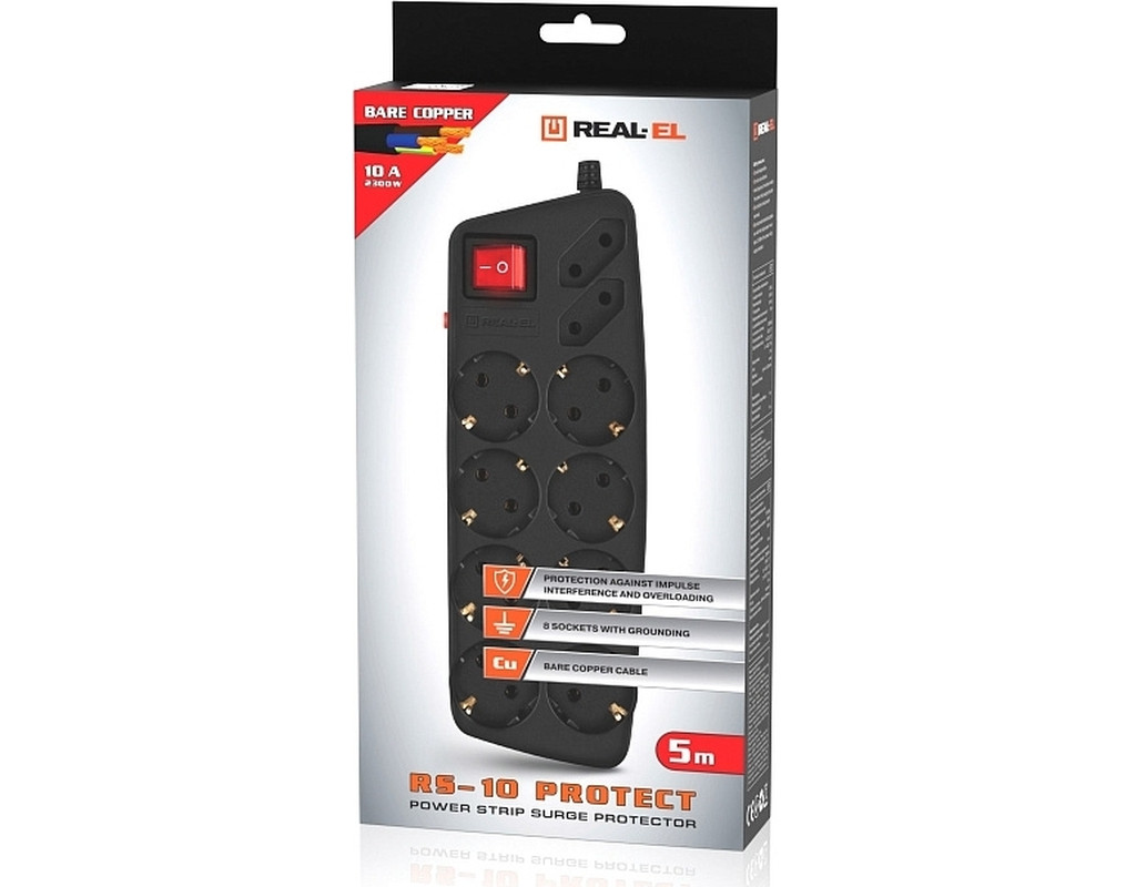 Мережевий фільтр-подовжувач REAL-EL RS-10 PROTECT – стиль, надійність і турбота про ваш комфорт. Він поєднує сучасний дизайн із практичною функціональністю, даруючи впевненість у кожному підключенні. Корпус із термостійкого пластика, продумана система захисту та якісний кабель гарантують довговічність і безпеку. Фільтр дозволяє підключити до десяти приладів одночасно: вісім розеток із заземленням та дві додаткові компактні пласкі розетки забезпечують універсальність використання. Зручна двополюсна кнопка живлення зі світловою індикацією дозволяє легко керувати підключеними пристроями. Оснащений багаторазовим біметалічним термозапобіжником, фільтр забезпечує додатковий захист від перевантажень і перегріву. Для ще більшої зручності передбачена можливість настінного кріплення, що економить простір і додає комфорту у використанні. REAL-EL RS-10 PROTECT – ваш надійний помічник у захисті та живленні техніки. Особливості