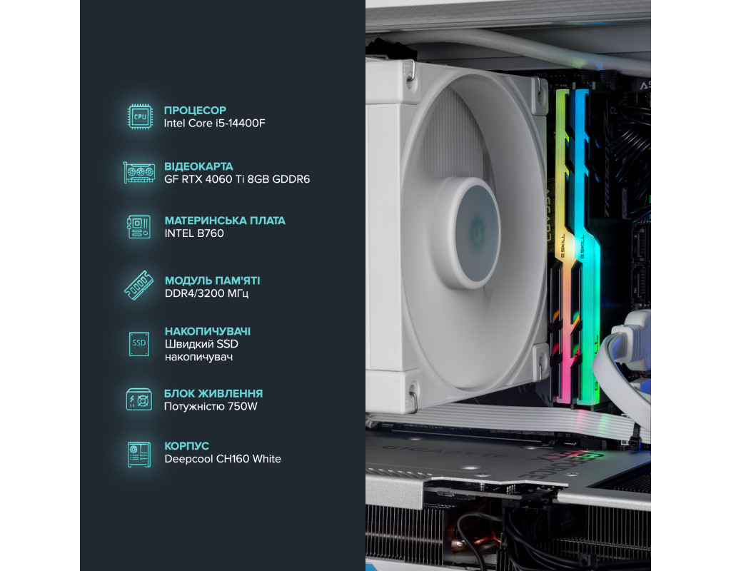 Персональний комп`ютер ASGARD (I144F.32.S10.46T.5274); Intel Core i5-14400F (2.5 - 4.7 ГГц) / ОЗУ 32 ГБ / SSD 1 ТБ / NVIDIA GeForce RTX 4060 Ti 8 ГБ / без ОП / LAN / Wi-Fi / Bluetooth / Ubuntu / білий