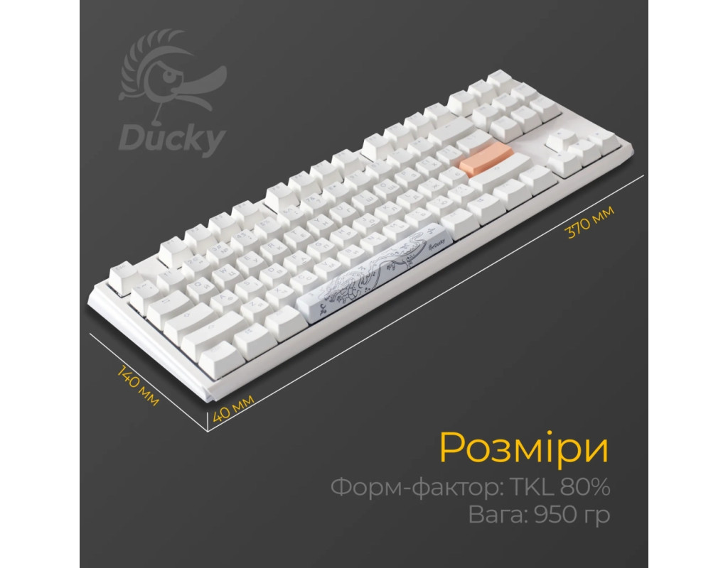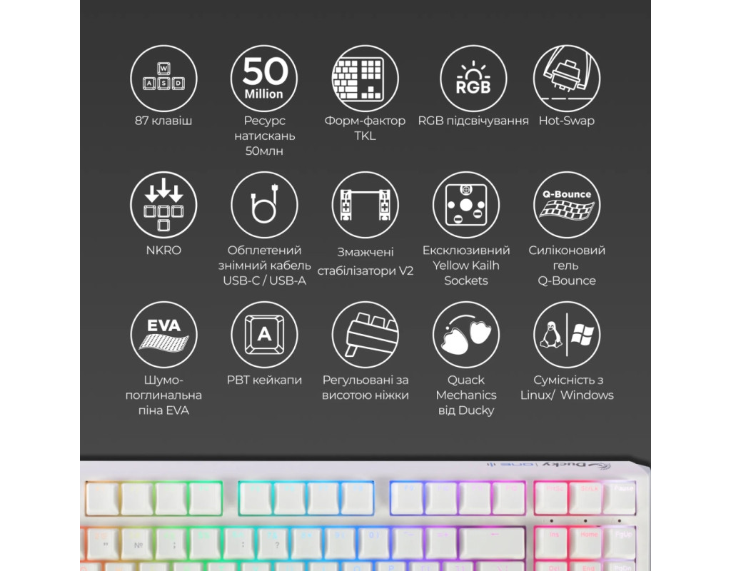 • Естетичний дизайн: Дизайн відповідає філософії Ducky «QUACK» Mechanics, поєднуючи естетику, функціональність та надійність. Матеріали найвищої якості забезпечують приємну акустику та комфортний тайпінг.