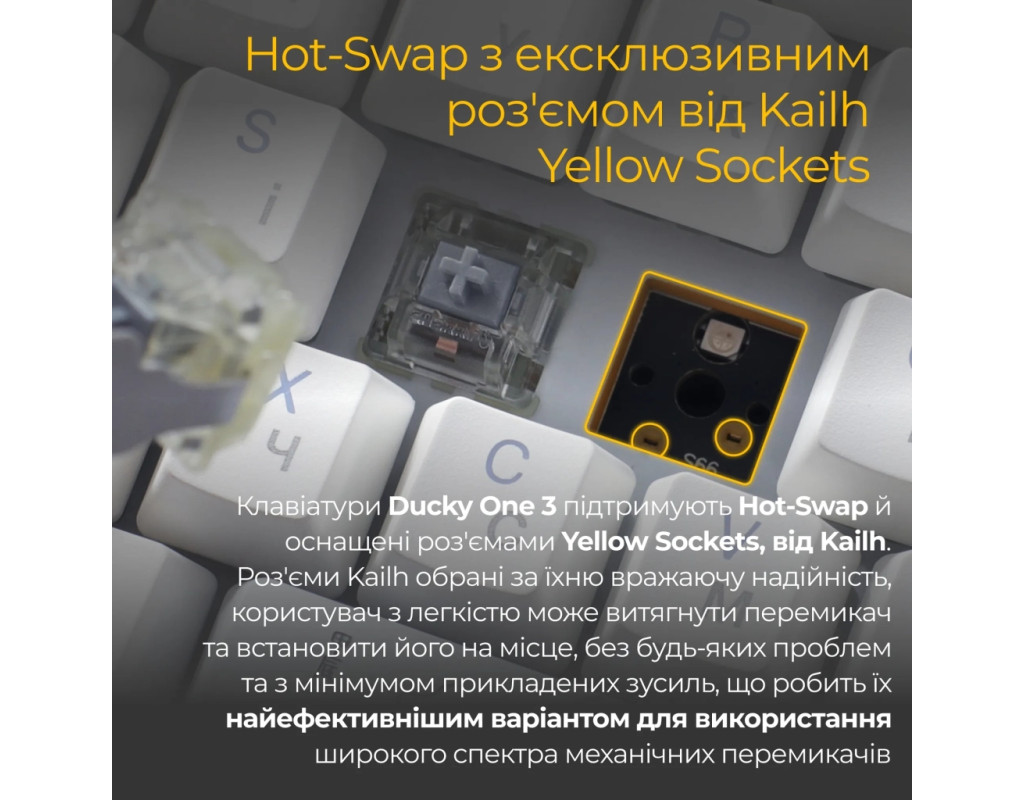 • Hot-Swap технологія: Завдяки Yellow Sockets від Kailh, користувач може легко змінювати перемикачі без ризику втрати контакту. Це відкриває безмежні можливості для кастомізації.