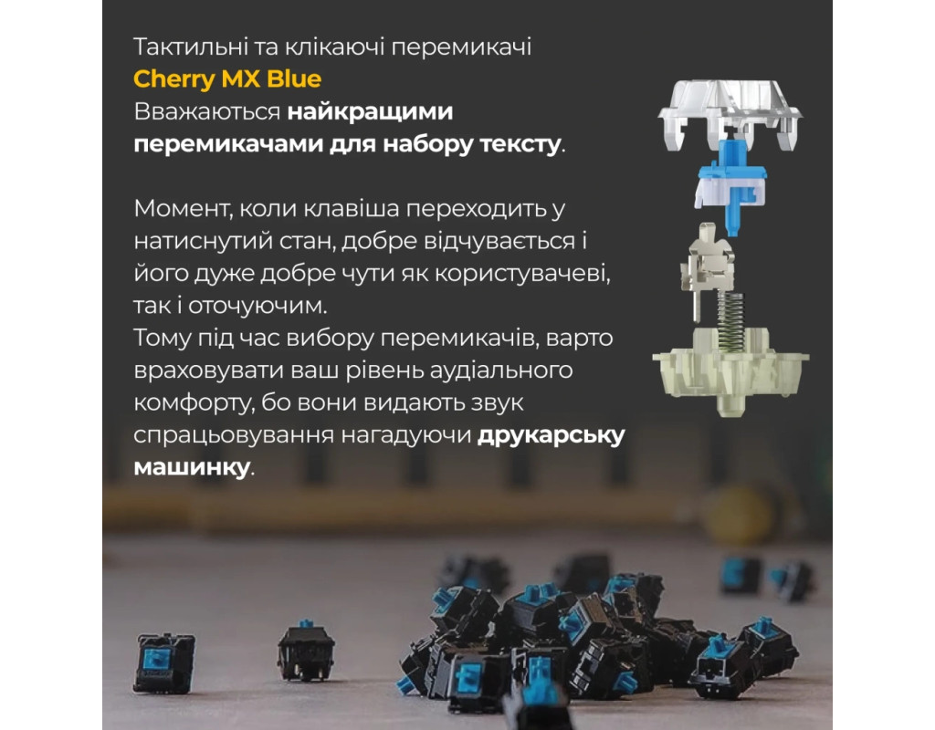 • Перемикачі: Використовуються тактильні та клікаючі перемикачі Cherry MX Blue. Вони ідеально підходять для набору тексту завдяки добре відчутній точці спрацьовування та характерному звуку.