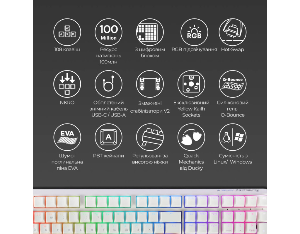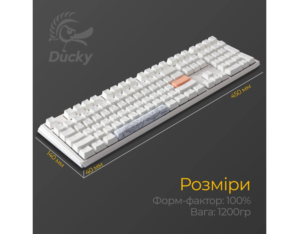 - Дизайн: Клавіатура створена згідно з філософією Ducky «QUACK» Mechanics, що поєднує естетику, функціональність і надійність, а також враховує приємну акустику.