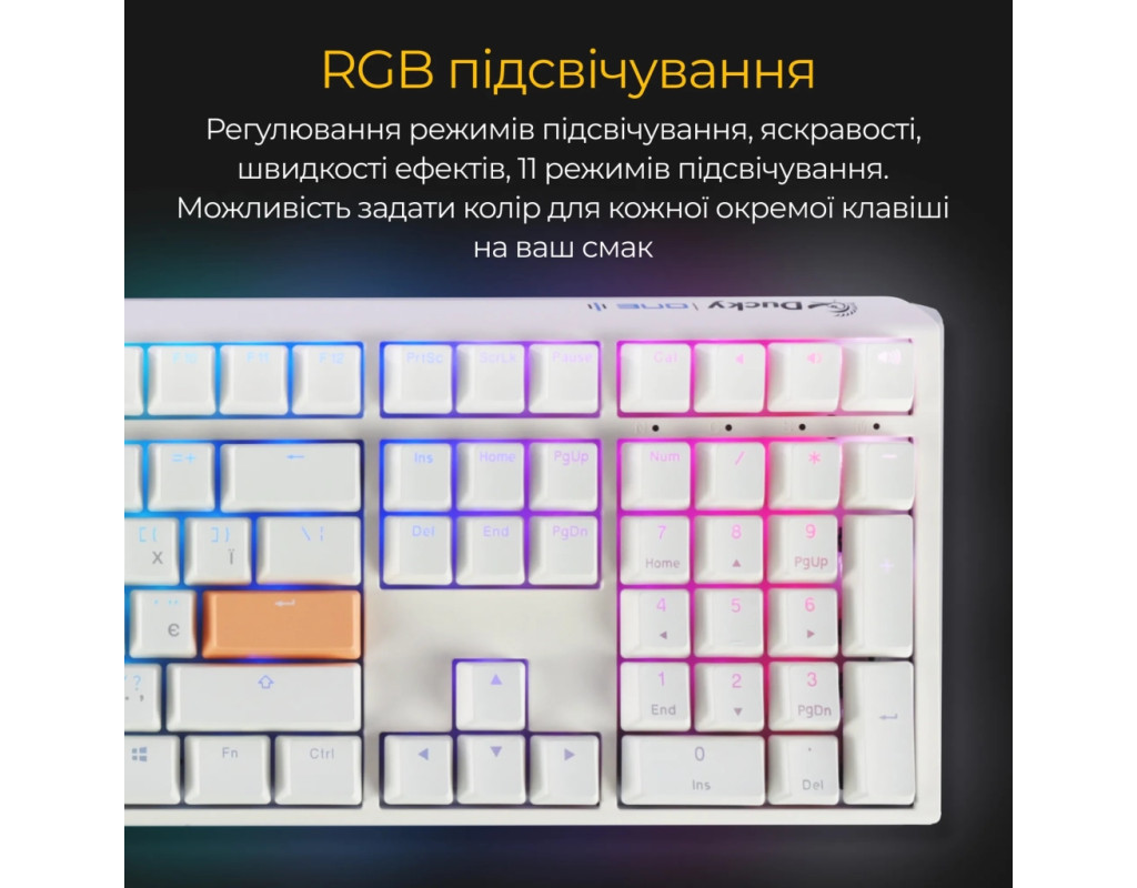 - RGB підсвічування: Яскраве та багатофункціональне RGB підсвічування налаштовується через програмовані макроси, що робить клавіатуру ще більш індивідуальною.