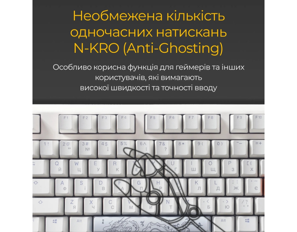 - NKRO технологія: Підтримка No Key Rollover забезпечує точне натискання кожної клавіші, навіть під час одночасного натискання кількох.