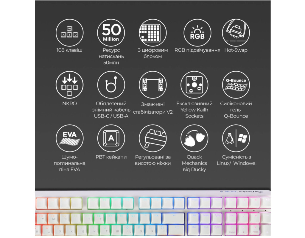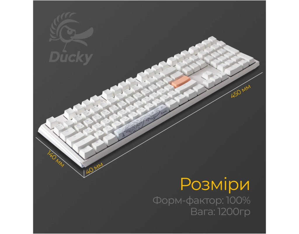 - Естетичний дизайн: Дизайн відповідає філософії Ducky «QUACK» Mechanics, поєднуючи естетику, функціональність та надійність. Матеріали найвищої якості забезпечують приємну акустику та комфортний тайпінг.