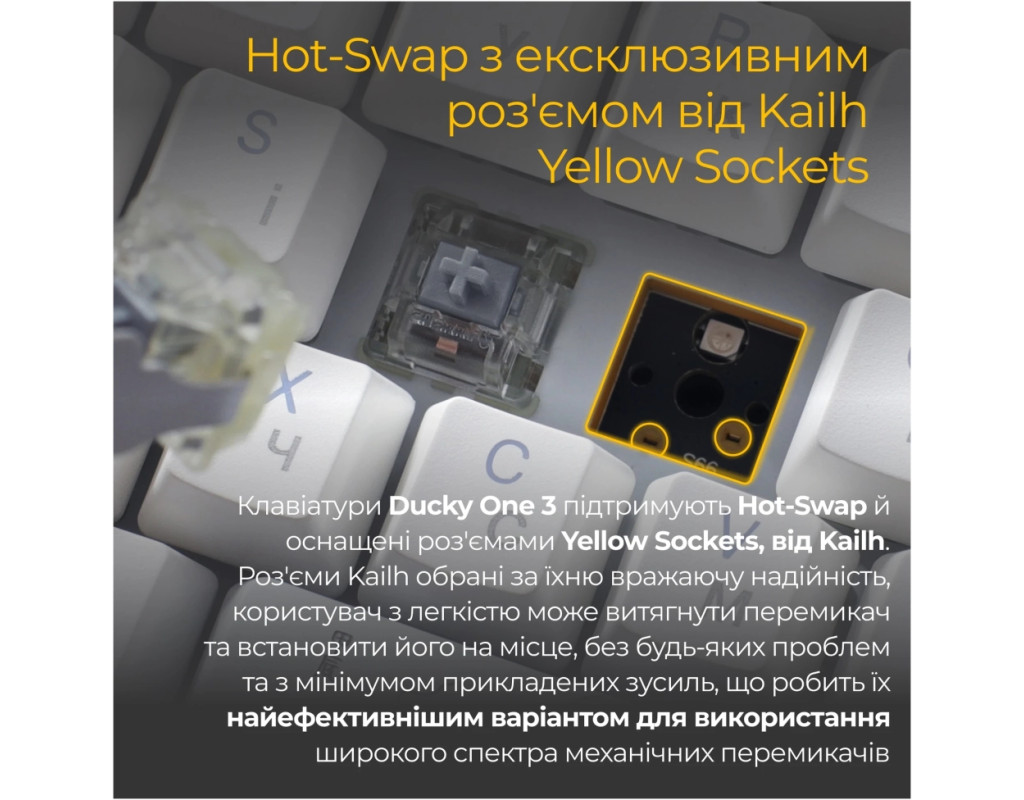 Механічна клавіатура Ducky One 3 — ідеальний вибір для тих, хто цінує поєднання якості, функціональності та стилю. Вона не лише вражає витонченим дизайном, а й забезпечує унікальний досвід використання завдяки сучасним технологіям. Основні характеристики: - Hot-Swap технологія: Завдяки Yellow Sockets від Kailh, користувач може легко змінювати перемикачі без ризику втрати контакту. Це відкриває безмежні можливості для кастомізації.