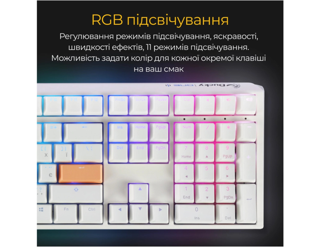 Комплектація: Включає пуллер для кейкапів і перемикачів, інструкцію з експлуатації та додатковий комплект кейкапів для персоналізації. Ducky One 3 — це не просто клавіатура, а інструмент для тих, хто прагне максимального комфорту та унікальності у своєму робочому просторі. Це елемент вашої особистості, що підкреслює вашу індивідуальність. |