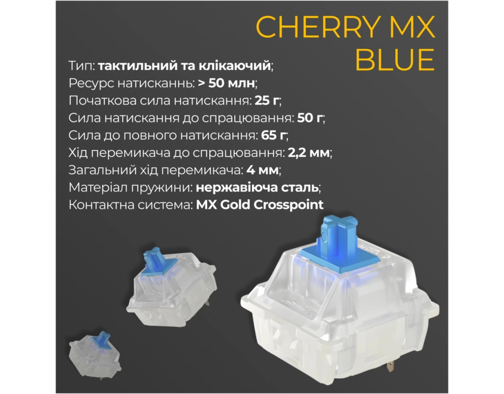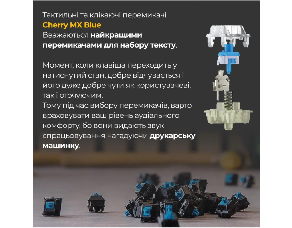 - Перемикачі: Використовуються тактильні та клікаючі перемикачі Cherry MX Blue. Вони ідеально підходять для набору тексту завдяки добре відчутній точці спрацьовування та характерному звуку.
