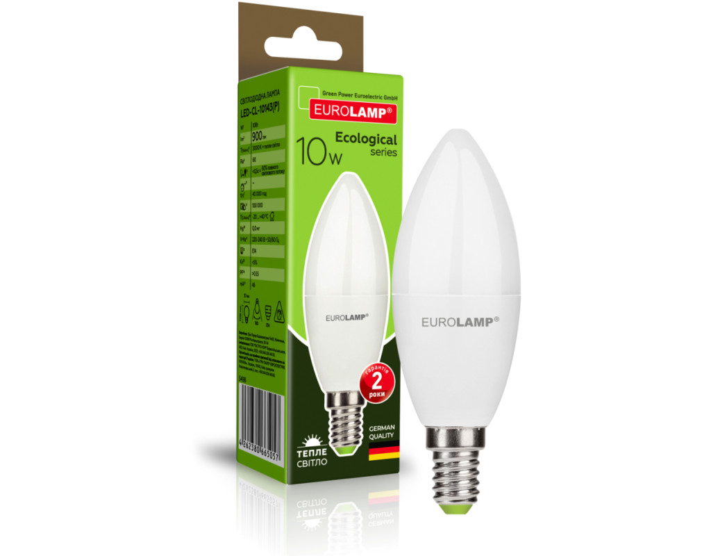 | Світлодіодна EUROLAMP LED Лампа “Свічка” ЕКО 10W E14 3000K Для кожного виду світильників необхідні різні типи ламп. Якщо у вас люстра з подовженим плафоном, то найкраще підійдуть лампи типу “Свічка”. Також, цей тип ламп прекрасно підійде під старовинні типи люстр. При виробництві лампи використовується особливий полімерний сплав, для створення якого використовується сучасна технологія хімічної обробки. Є абсолютно безпечною для здоров’я людини і навколишнього середовища завдяки даному екологічному пластику. Лампа забезпечує приміщення якісним світлом без мерехтінь і відблисків. Лампа здатна дати потужний світловий потік, який становить 900 Lm, при невеликому споживанні потужності світлодіода. Лампа витримує перепади напруги в діапазоні 220-240 V без наслідків працездатності. Особливості ламп ТМ Eurolamp: