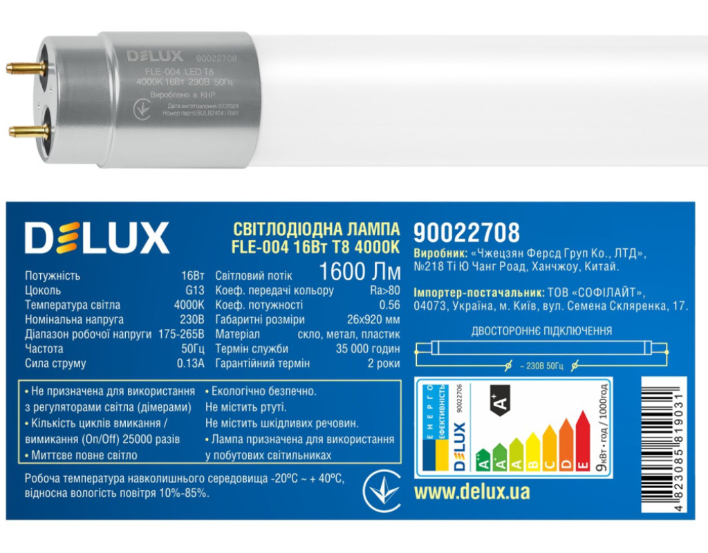 Свтлодіодна лампа Delux FLE-004 - енергозберігаюче джерело світла на основі сучасних технологій. Пряма заміна люмінесцентної лампи у промислових та побутових світильниках. Не потребує ПРА - підключення до мережі 220 В.