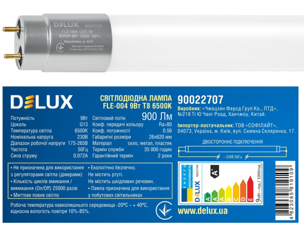 Тип лампи - світлодіодні (LED), тип цоколя - G13, Потужність - 9 Вт, колірна температура - 6500 К, 220-240 В, Особливості - енергоефективність 80% (A +)