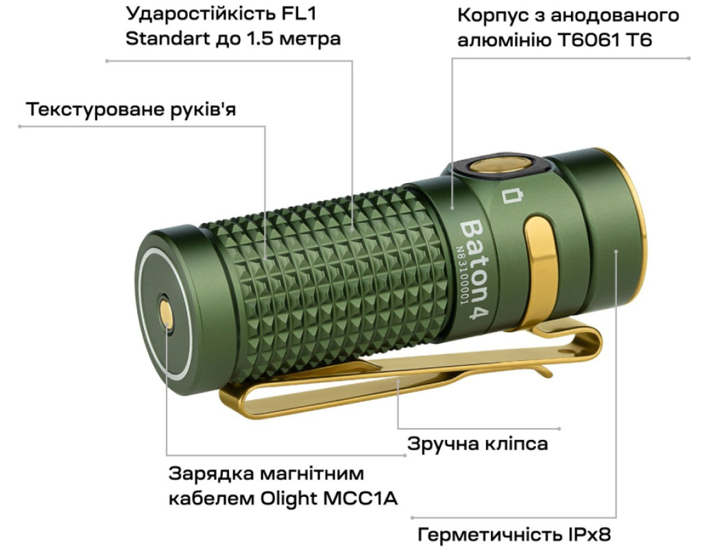 | Ліхтар Olight Baton 4 OD Green (0.0000.0862) - це яскравий приклад технологічного досконалості та сучасного дизайну, що об'єднує стильний вигляд і бездоганні функціональні можливості. Цей пристрій ідеально підходить для активностей як у місті, так і на природі, завдяки своїй легкості та компактності, що роблять його незамінним супутником у будь-яких умовах. Оснащений надсучасним світлодіодом CW LED і лінзою TIR, ліхтар забезпечує м'який і збалансований світловий потік потужністю до 1300 люмен, ефективно освітлюючи простір на відстані до 170 метрів. Незважаючи на вражаючу потужність, ліхтар також може працювати в економічному режимі 0,5 люмена протягом неймовірних 30 днів безперервної роботи, що робить його ідеальним рішенням для довготривалих подорожей. Корпус виготовлений з легкого, але водночас надзвичайно міцного алюмінію, а також має шорстку текстуру, яка ефективно запобігає вислизанню з руки. Ліхтар має високий клас захисту IPX-8, що забезпечує повну водонепроникність при зануренні на глибину до 2 метрів протягом 30 хвилин. Це робить його ідеальним партнером навіть у найсуворіших умовах. Крім того, він витримує падіння з висоти до 1,5 метри, що підтверджує його ударостійкість. Особливу зручність користування забезпечує міцний металевий вимикач, що забезпечує інтуїтивну та надійну зміну режимів роботи. Пристрій комплектується магнітним зарядним кабелем MCC 1 A, що дозволяє швидко та легко заряджати акумулятор IMR16340 3.6V 650 mAh, зберігаючи заряд до 30 днів. Інноваційний дизайн передбачає зелений світлодіод поряд із вимикачем, що інформує про рівень заряду, роблячи використання ще більш зручним. Ліхтар підтримує п'ять режимів яскравості: від максимального (1300 люмен) для освітлення великих просторів до турбо- та стробоскопічного режимів, що відповідають за максимальну потужність у екстрених ситуаціях. Завдяки стаціонарній головці ліхтаря зменшено ризик пошкодження, а плаский ковпачок дозволяє розміщення у вертикальному положенні. Завдяки знімній еластичній кліпсі, ліхтар легко кріпиться до краю кишені або спорядження, забезпечуючи комфортне перенесення. В комплект входить не лише якісний магнітний зарядний кабель та акумулятор, але й зручний чохол, що забезпечує додатковий захист та комфорт у транспортуванні. Ліхтар Olight Baton 4 OD Green - це ідеальний вибір для тих, хто цінує надійність, якість та сучасні технології. Його універсальність і функціональність забезпечують найвищий комфорт використання в будь-яких умовах, роблячи його незамінним елементом кожноденної амуніції або спорядження мандрівника. З цим ліхтарем ви завжди будете в центрі уваги - і в світлі! |