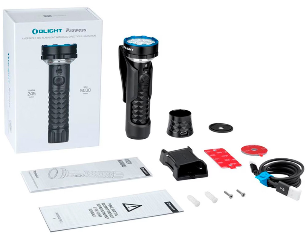 Ліхтар Olight Prowess - це новинка бренду, яка стане у пригоді під час походів, кемпінгів та пошукових операцій. Ліхтар оснащений 6 високоефективними світлодіодами High-Performance LED, вбудованими в рефлектор, що забезпечує потужне біле світло до 5 000 люмен і дальність дії до 245 метрів. З іншого боку голови розташовані високоефективні світлодіоди теплого білого кольору, що випромінюють до 800 люменів теплого світла, яке розсіюється на 360 градусів, завдяки чому модель може працювати як світильник. У мінімальному режимі (5 люмен) пристрій може світити безперервно протягом 20 днів. Пристрій живиться від акумулятора Li-Ion 21700 ємністю 5000 мАг та заряджається за допомогою USB або магнітного кабелю Olight MCC3 (не входить до комплекту). Корпус виготовлений з ударостійкого аерокосмічного алюмінію A6061-T6 зі ступенем водонепроникності IPX7, що забезпечує захист від занурення в воду на глибину до 1 метра на термін до 30 хвилин, а також витримує падіння з висоти до 1 метра. До комплекту також входить кронштейн з опорою і кріпленнями, які дозволяють зачепити ліхтар за край кишені або закріпити його на стіні чи на торпеді автомобіля. Крім того, на нижній стороні знімної основи є різьблення 1/4" для прикручування ліхтаря на підставку, сумісну з цим кріпленням. Режим роботи (Холодний білий): - Турбо / 5000-1200 лм / 245 м / 3 + 140 хв,- High / 1200-300 лм / 120 м / 150 + 30 хв, - Med / 300 лм / 63 м / 10 год, - Low / 50 лм / 27 м / 50 год, - Місяць / 5 лм / 9 м / 20 днів, - Строб / 13 Гц. Режим роботи (Теплий білий): - Турбо / 800-600-400 лм / 35 м / 20 + 135 + 55 хв,- Низький / 2 лм / 2,5 м / 20 днів. |