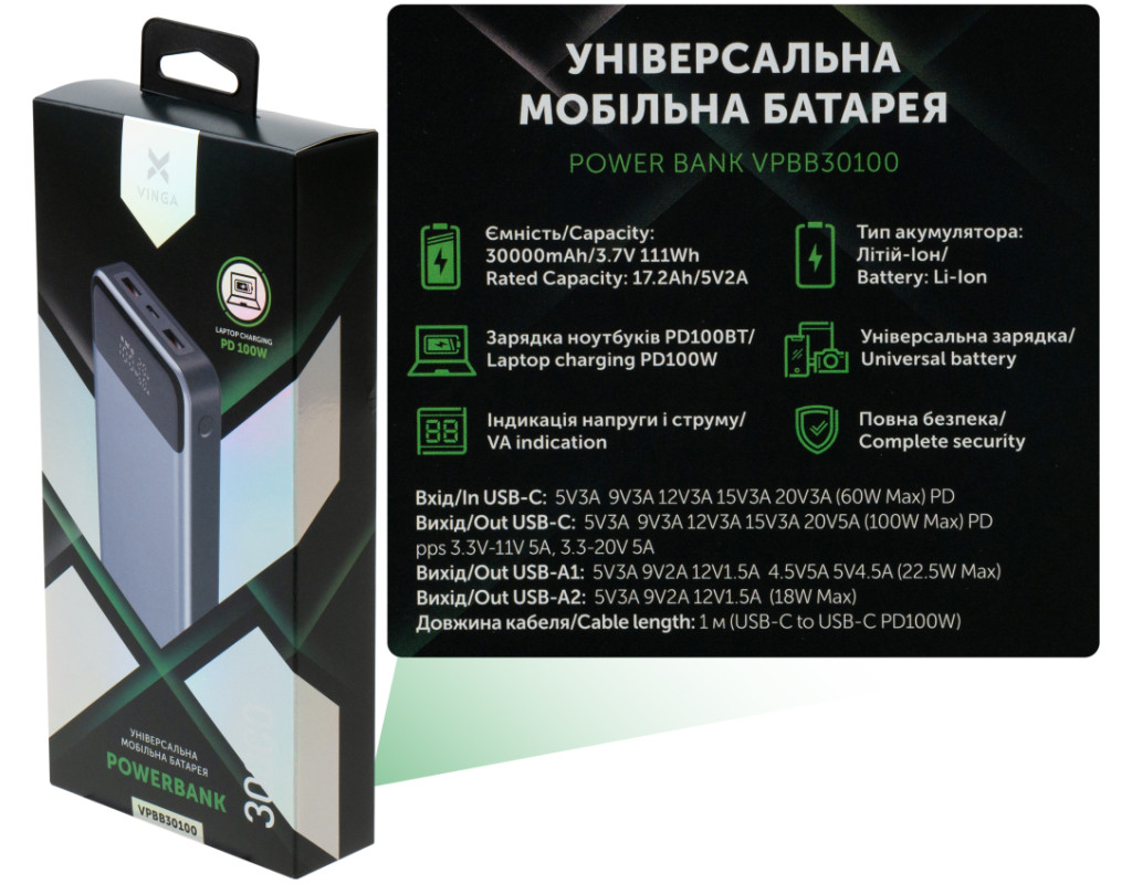 | Відкрийте для себе універсальну батарею Vinga 30000 mAh 100W Display VA Grey, яка стане ідеальним супутником для будь-якого цифрового пристрою. З велетенською ємністю 30000 mAh, цей зовнішній акумулятор забезпечить вам можливість тривалого використання вашого смартфона, планшета, ноутбука або інших девайсів, куди б ви не відправилися. Електрохімічна система Li-Ion гарантує ефективність і надійність роботи, а також довгий термін служби батареї. Це чудове рішення для тих, хто цінує якість і шукає надійний джерело енергії для смарт-годинників, роутерів та плеєрів. Vinga 30000 mAh має зручні інтерфейси підключення: USB Type-C і USB, що дозволяють легко заряджати пристрої. Два вихідні порти USB Type-C та один USB-порт забезпечують максимальну гнучкість у підключенні, підвищуючи вашу мобільність та комфорт. Крім того, функція Power Delivery дозволяє заряджати ваші пристрої швидше, ніж звичайні портативні батареї, що економить ваш час. Стильний сірий колір робить цей аксесуар не лише функціональним, але й стильним додатком до вашого повсякденного життя. Ви можете бути впевнені, що ця батарея підкреслить ваш стиль, забезпечивши ваших девайсів потужністю в будь-якій ситуації. Вибираючи Vinga, ви отримуєте високоякісний продукт, створений для тих, хто цінує зручність, надійність і ефективність. Не втрачайте можливості бути на зв'язку і насолоджуватися своїми пристроями на повну завдяки цьому універсальному портативному зарядному пристрою. |