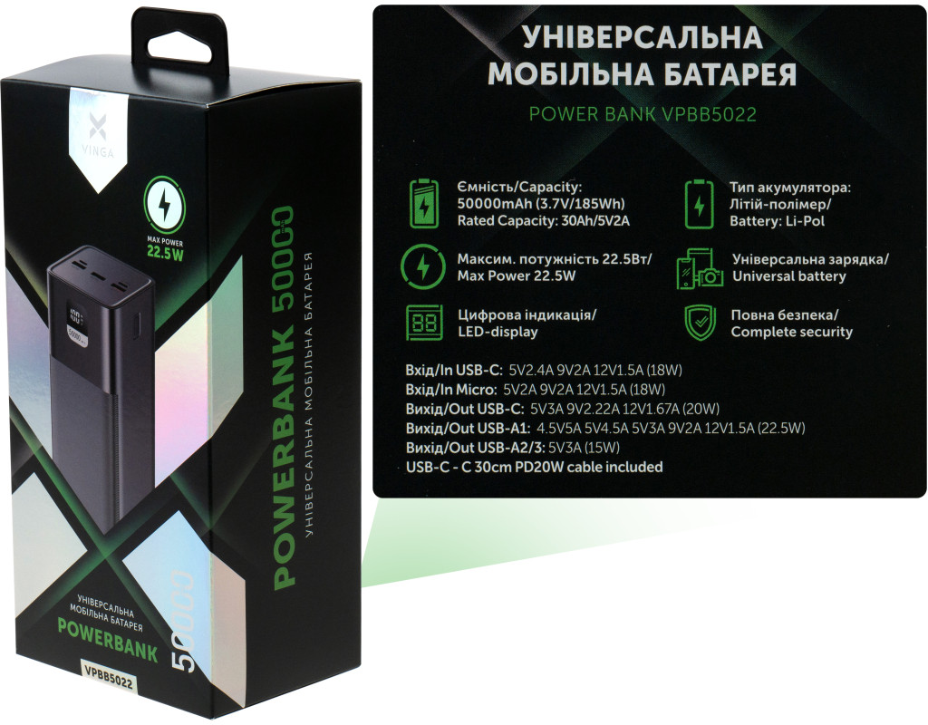 | Залишайтесь на зв'язку з універсальною батареєю Vinga 50000 mAh 22.5W Display Black (VPBB5022), яка є ідеальним рішенням для тих, хто завжди в русі. Завдяки величезній ємності у 50000 mAh, ця модель забезпечить енергію вашим пристроям у будь-якому місці та в будь-який час. Чи ви подорожуєте, відпочиваєте на природі або у вас просто немає доступу до розетки, ця батарея стане надійним джерелом живлення. Батарея розроблена з урахуванням сумісності з різними гаджетами, що робить її ідеальним вибором для смартфонів, планшетів, роутерів, плеєрів і смарт-годинників. Використання сучасної електрохімічної системи Li-pol гарантує ефективність та стабільність під час тривалих циклів зарядження та розрядження. Батарея Vinga VPBB5022 обладнано зручними інтерфейсами входу та виходу, включаючи microUSB, USB Type-C і три USB-виходи, що дозволяє одночасно заряджати декілька пристроїв. Це особливо зручно для тих, хто звик підтримувати заряд своїх гаджетів протягом усього дня. Унікальною перевагою цієї батареї є цифровий дисплей, який відображає рівень заряду, що дозволяє з легкістю контролювати процес поповнення енергії та вчасно підключати батарею до зарядки. Це забезпечує зручність та підвищену функціональність у використанні. Захист від короткого замикання та перегріву гарантує безпеку під час експлуатації. Ви можете бути спокійними, знаючи, що ваші пристрої в надійних руках. Корпус, виготовлений із якісного термопластику, має не лише стильний вигляд, але й стійкість до механічних пошкоджень, що підвищує довговічність використання. Витримуючи високі стандарти якості, батарея Vinga 50000 mAh вражає своєю ефективністю та універсальністю. Оберіть її для себе та переконайтесь, наскільки легше та мобільніше може бути ваше життя з потужною підтримкою від Vinga. Із стильним чорним кольором, ця модель стане не лише функціональним, але й естетично привабливим аксесуаром, вдало доповнюючи ваш технологічний арсенал. Насолоджуйтесь свободою пересування, не думайте про відсутність розеток і тримайте ваші пристрої в дії за будь-яких умов! |